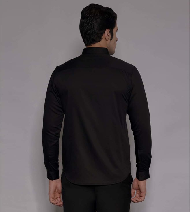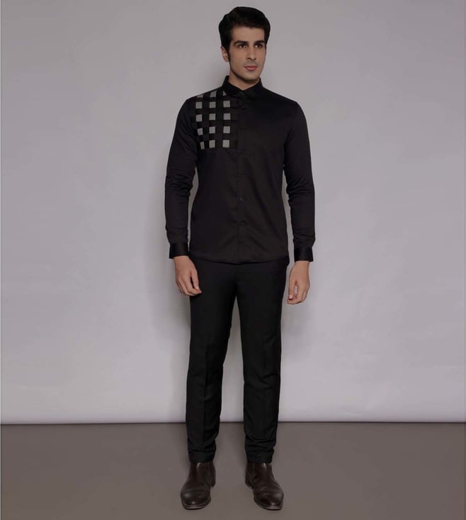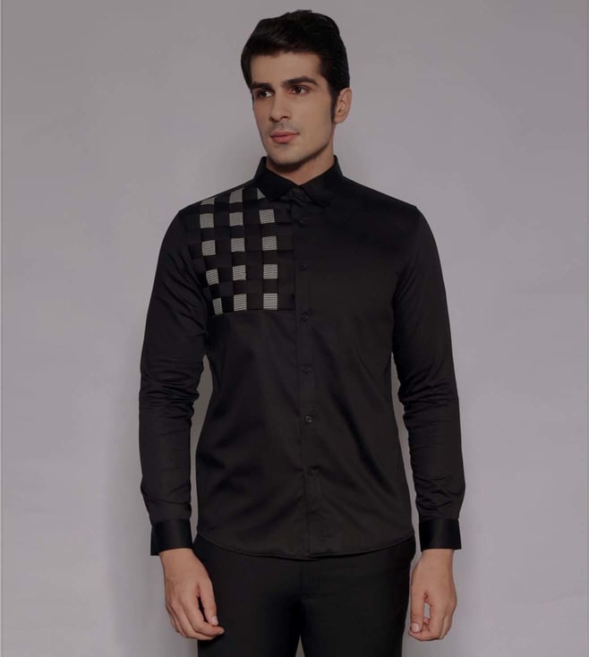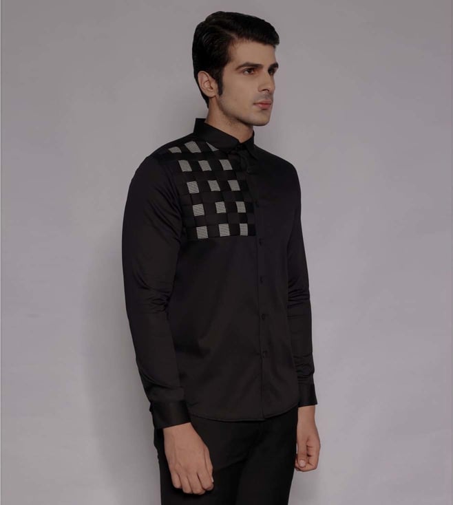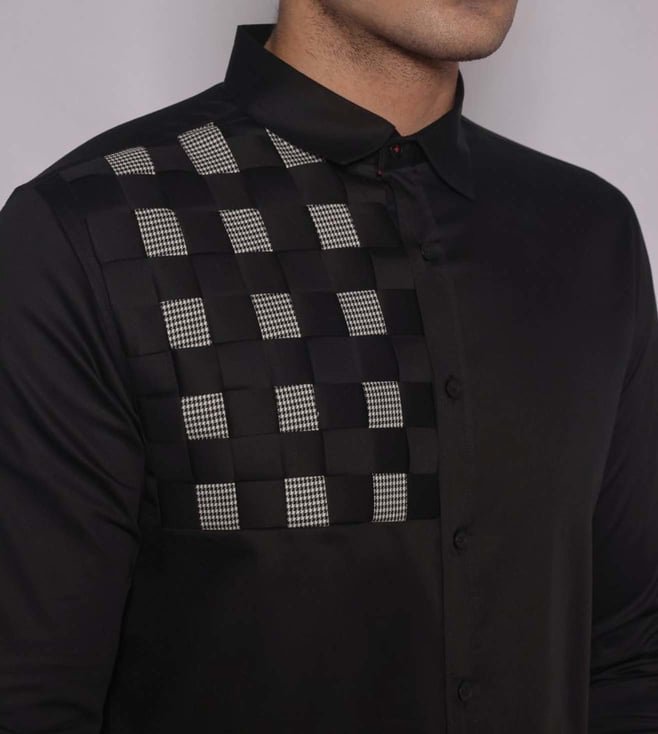 Crafted in luxurious cotton satin, this shirt redefines evening elegance with its subtle yet striking detailing. The upper front panel features a distinctive basket-weave surface texture, contrasted by a sharp houndstooth fabric insert on one side for a modern asymmetric edge. Disclaimer: All other items in the image are only for display purposes and will not be a part of the delivery content. Product colour may slightly vary due to photographic lighting sources. Country of Origin - India.