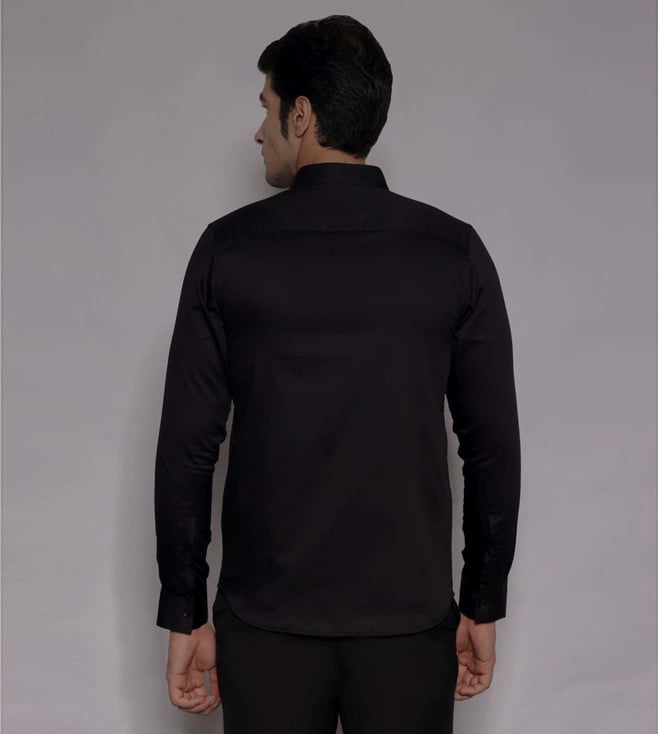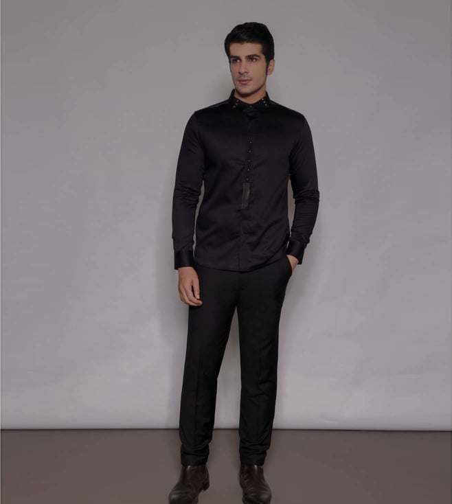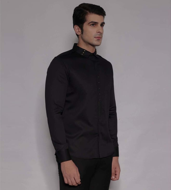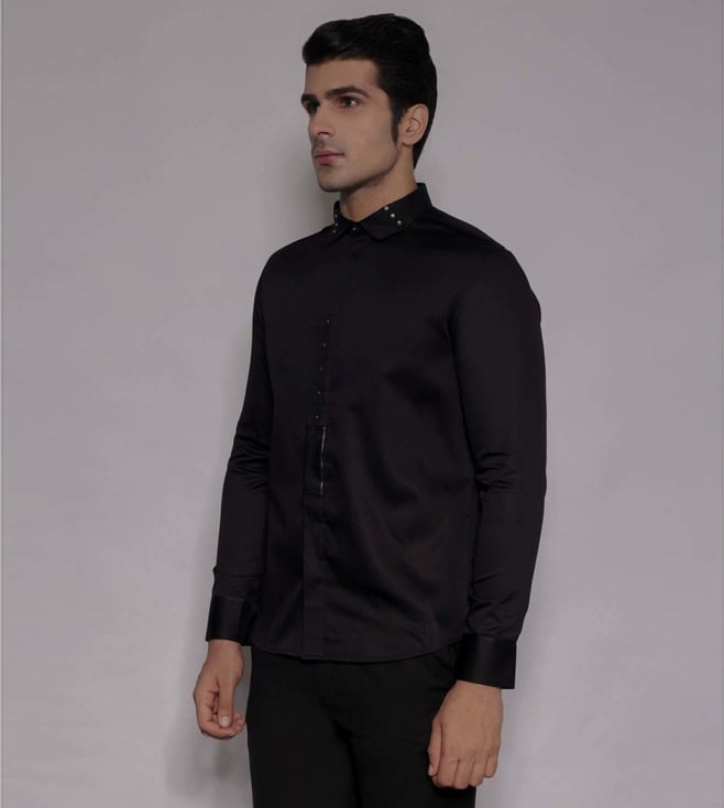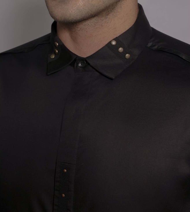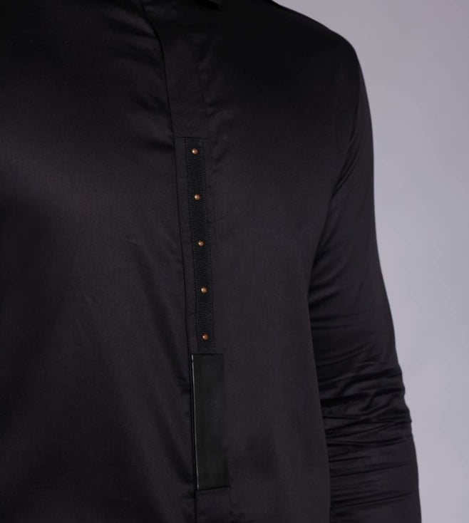 This cotton satin full-sleeve shirt features a classic collar with gold rivet tape detailing. Leather and rivet accents along the placket and satin shoulder panels add a bold metallic edge, while the concealed placket keeps the design sleek. Pair it with tailored trousers or slim-fit denim and subtle accessories. Disclaimer: All other items in the image are only for display purposes and will not be a part of the delivery content. Product colour may slightly vary due to photographic lighting sources. Country of Origin - India.