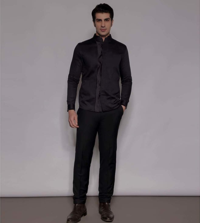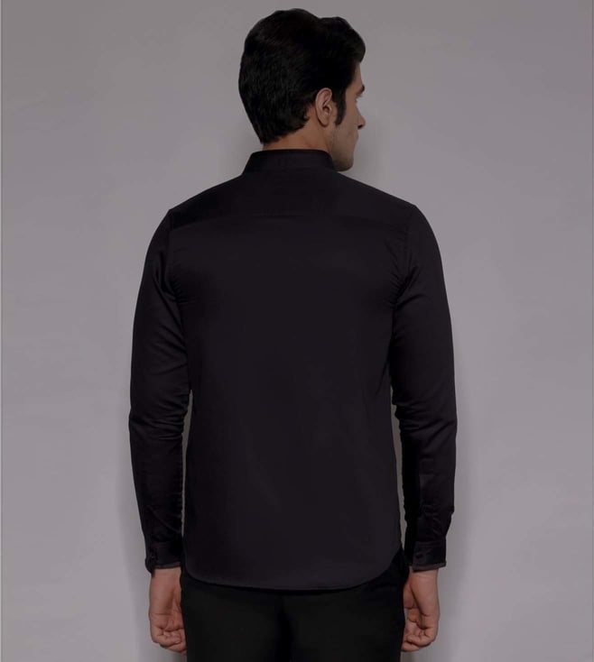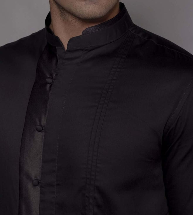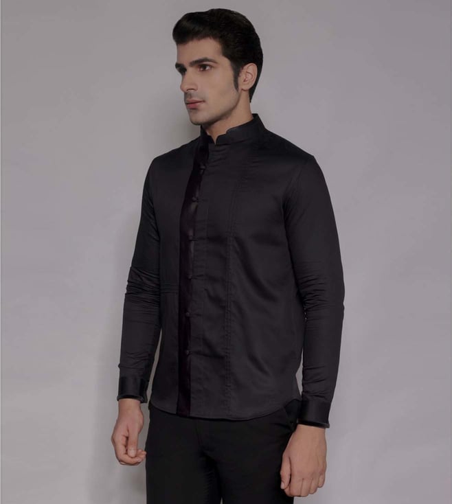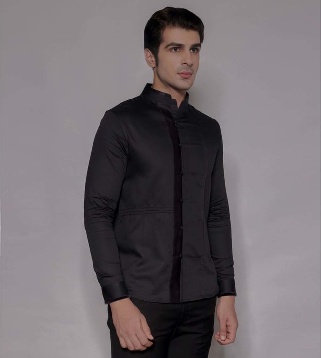 A cotton satin full-sleeve shirt has a mandarin collar with textured fabric, loop placket with handmade buttons, cut-and-sew satin panel, and pin tuck details. Velvet binding on the sleeves adds refinement. Pair with dark tailored trousers and minimal accessories for an elevated evening statement. Disclaimer: All other items in the image are only for display purposes and will not be a part of the delivery content. Product colour may slightly vary due to photographic lighting sources. Country of Origin - India.