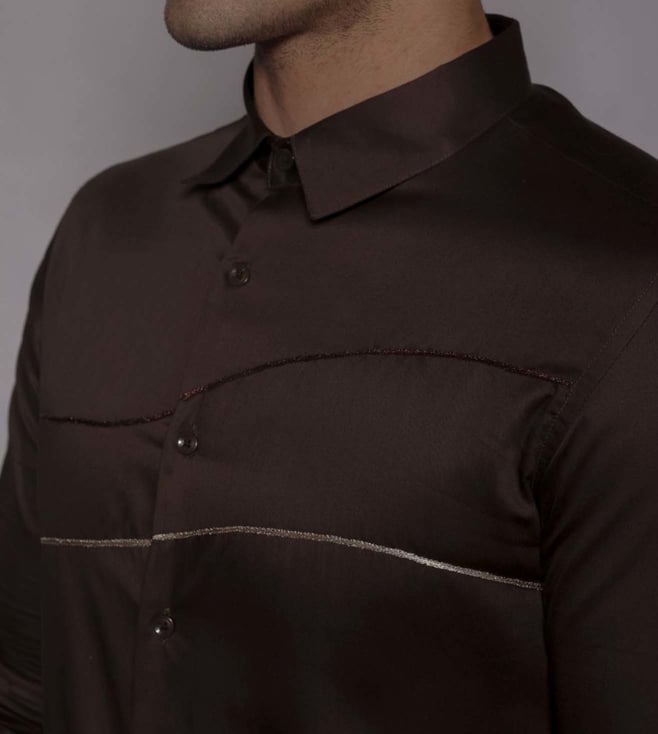 This cotton satin full-sleeve shirt has a classic collar and front panel abstract zari embroidery. Finished with a clean hemline, it balances simplicity and festive sophistication. Pair with tailored trousers and polished shoes for a refined evening look. Disclaimer: All other items in the image are only for display purposes and will not be a part of the delivery content. Product colour may slightly vary due to photographic lighting sources. Country of Origin - India.