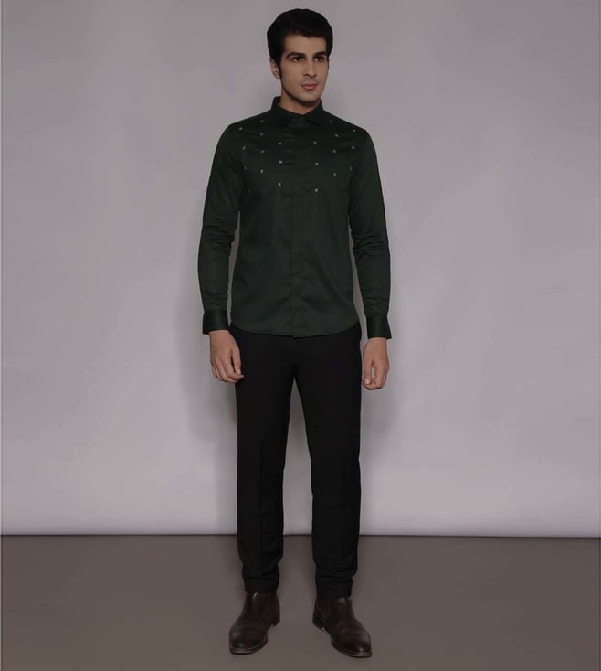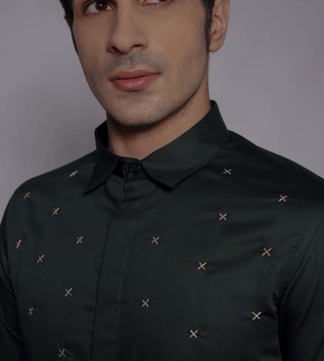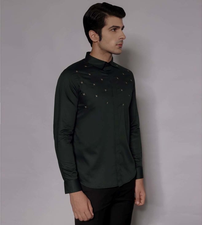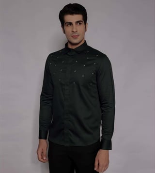 An evening wear cotton satin full-sleeve shirt features refined sleeve tucks, a stylised collar, and two-tone zari embroidery. Finished with a concealed placket, it pairs perfectly with tailored trousers and polished shoes for a sharp, elegant evening look. Disclaimer: All other items in the image are only for display purposes and will not be a part of the delivery content. Product colour may slightly vary due to photographic lighting sources. Country of Origin - India.