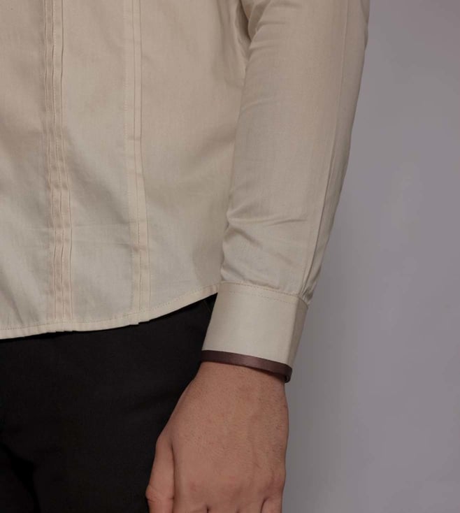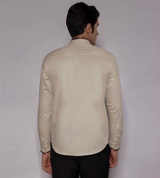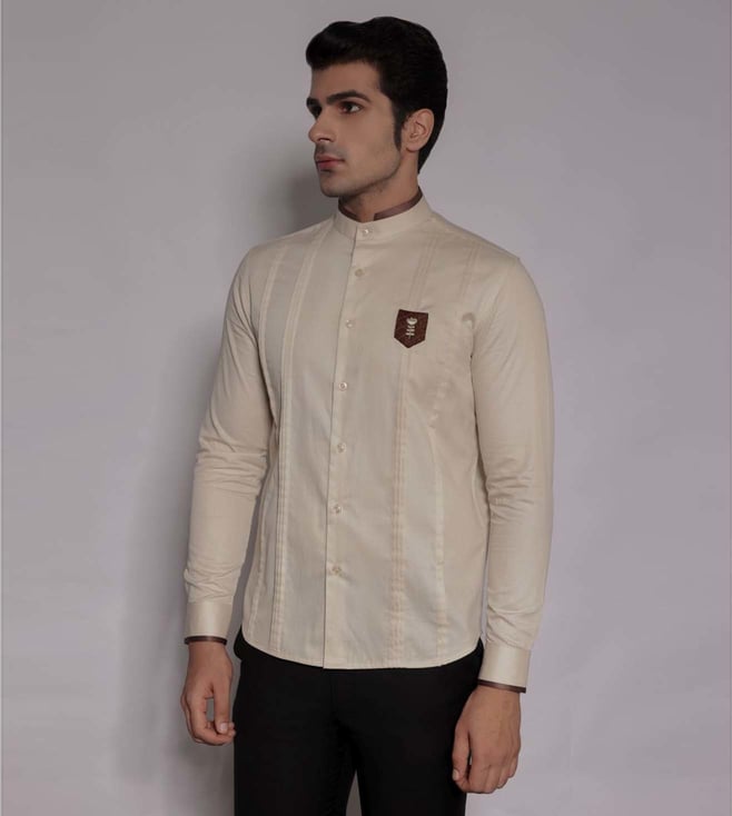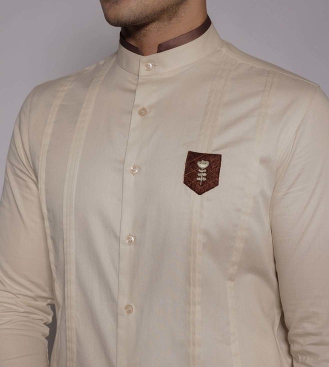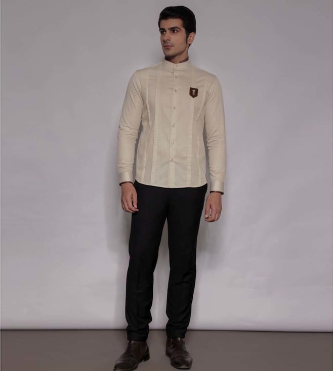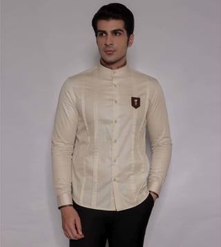 This cotton satin full-sleeve shirt features uneven front tucks for a modern texture. A mandarin collar with satin accents and crest embroidery adds sophistication. Finished with a normal placket and satin-bound cuffs, it pairs well with tailored trousers and polished shoes for refined evenings. Disclaimer: All other items in the image are only for display purposes and will not be a part of the delivery content. Product colour may slightly vary due to photographic lighting sources. Country of Origin - India.