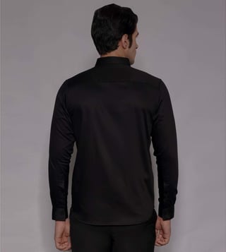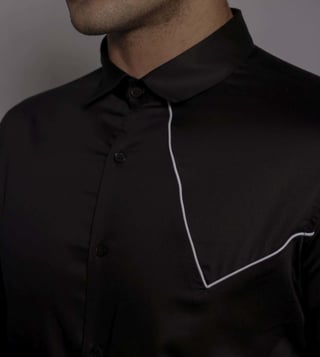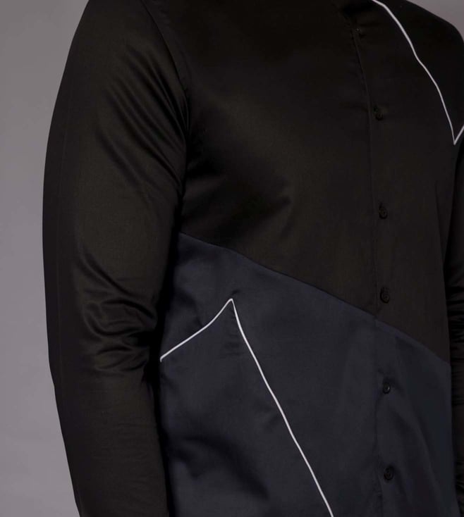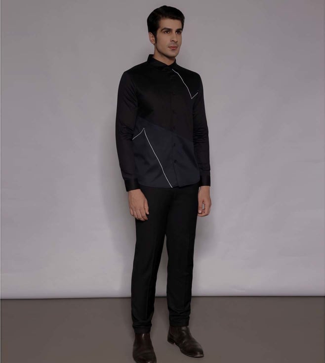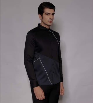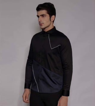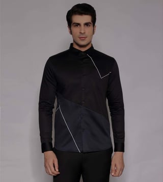 This cotton satin full-sleeve shirt features a classic collar, a bold bias cut-and-sew front panel, and white piping accents. Finished with a normal placket and hemline, it offers a modern geometric aesthetic. Pair with slim-fit trousers and minimal accessories for a sleek evening look. Disclaimer: All other items in the image are only for display purposes and will not be a part of the delivery content. Product colour may slightly vary due to photographic lighting sources. Country of Origin - India.