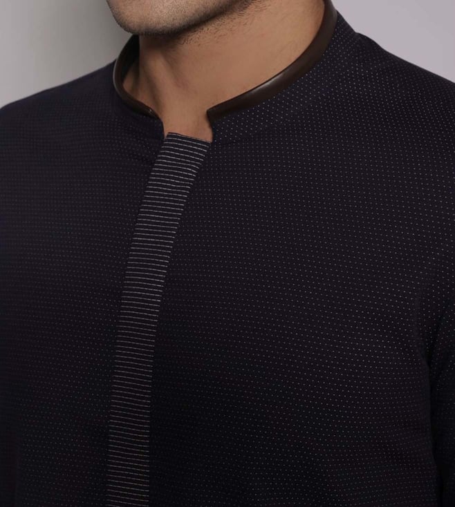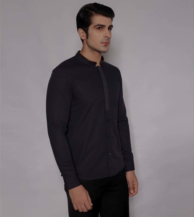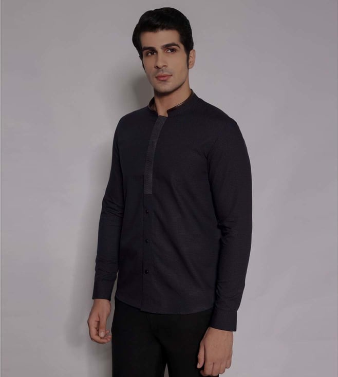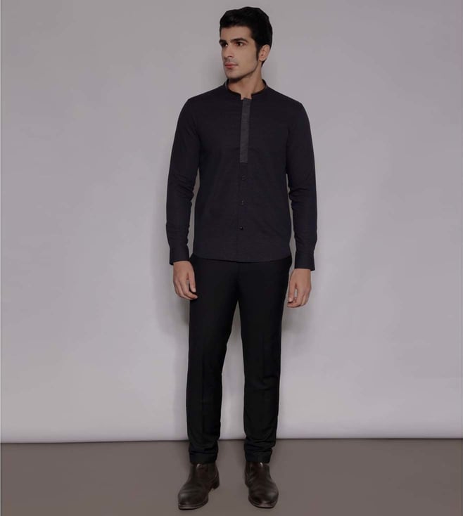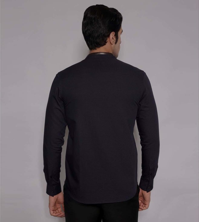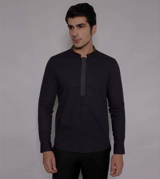 This cotton satin full-sleeve shirt with a mandarin collar features leather accents, a half-concealed placket, and gunmetal buttons. The design blends texture, contrast, and refined craftsmanship. Pair with tailored trousers and polished shoes for an elegant evening appearance. Disclaimer: All other items in the image are only for display purposes and will not be a part of the delivery content. Product colour may slightly vary due to photographic lighting sources. Country of Origin - India.