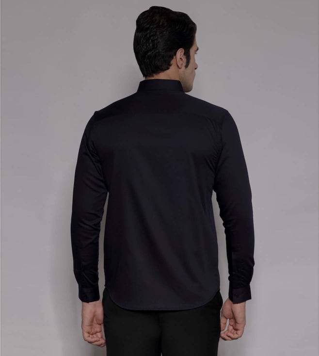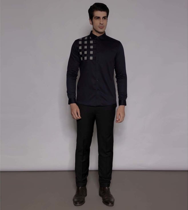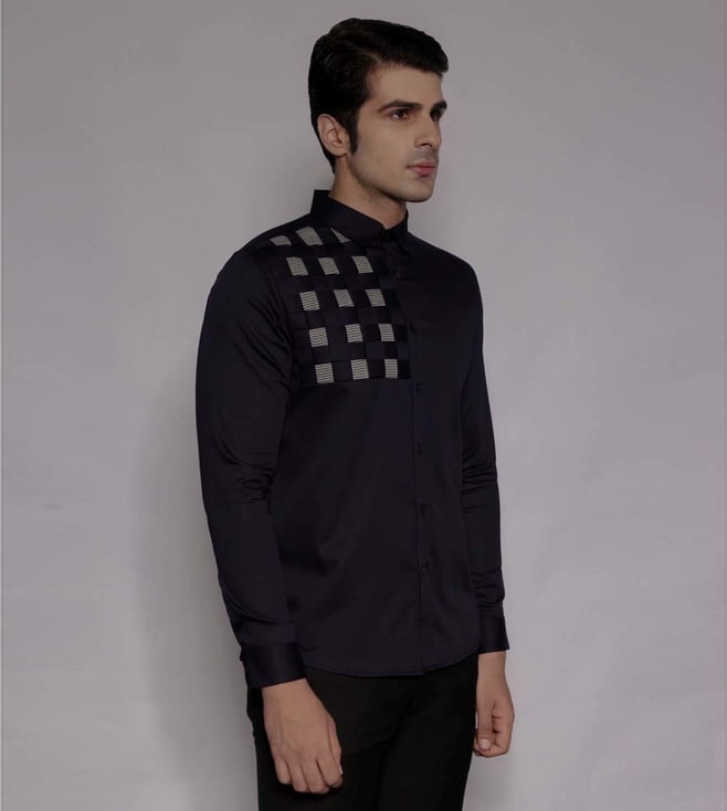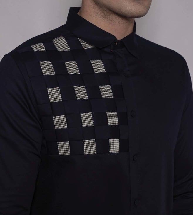 Crafted in cotton satin, this full-sleeve men¿s party shirt has a basket-weave front panel with a houndstooth insert for an asymmetric edge. Red accents near the collar add sophistication, while the classic collar and placket maintain timeless appeal. Pair with slim trousers and minimal accessories. Disclaimer: All other items in the image are only for display purposes and will not be a part of the delivery content. Product colour may slightly vary due to photographic lighting sources. Country of Origin - India.