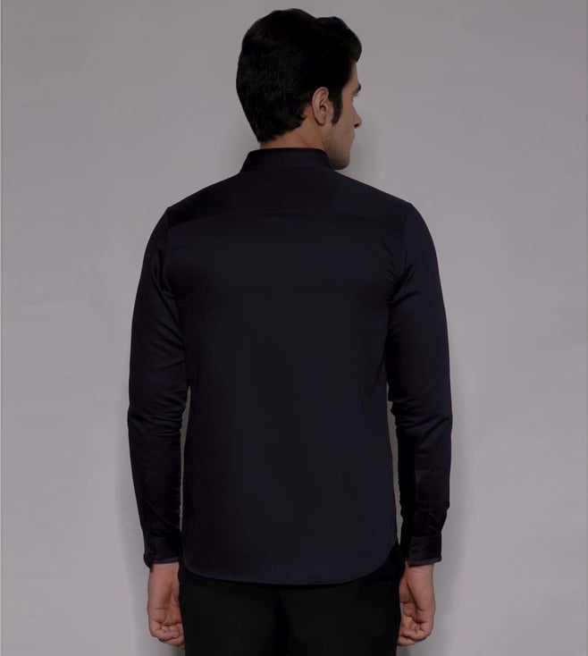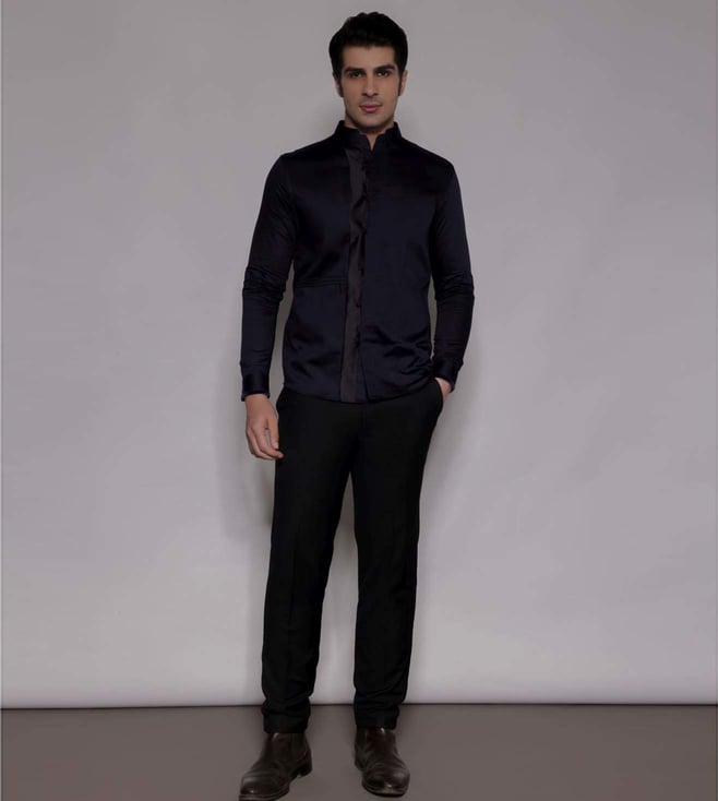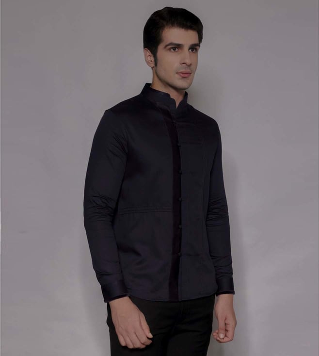 A cotton satin full-sleeve shirt features a mandarin collar with textured fabric, loop placket, cut-and-sew satin panel, and pin tuck details. Velvet sleeve binding adds elegance. Pair with dark tailored trousers and minimal accessories for a polished evening appearance. Disclaimer: All other items in the image are only for display purposes and will not be a part of the delivery content. Product colour may slightly vary due to photographic lighting sources. Country of Origin - India.