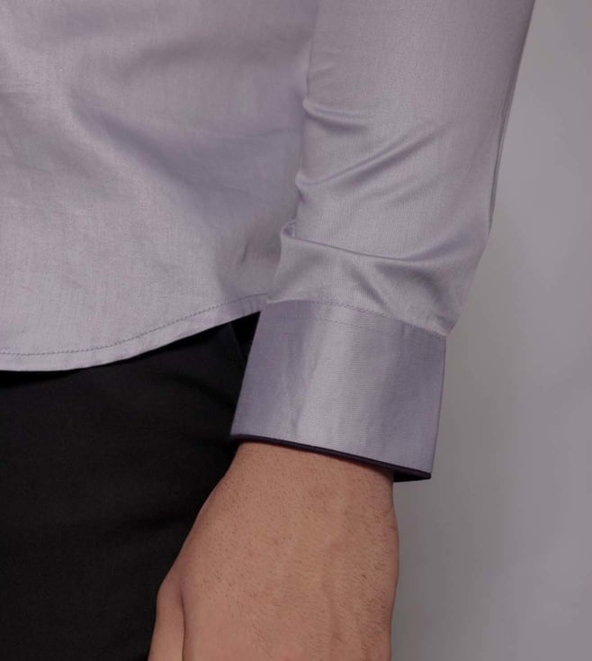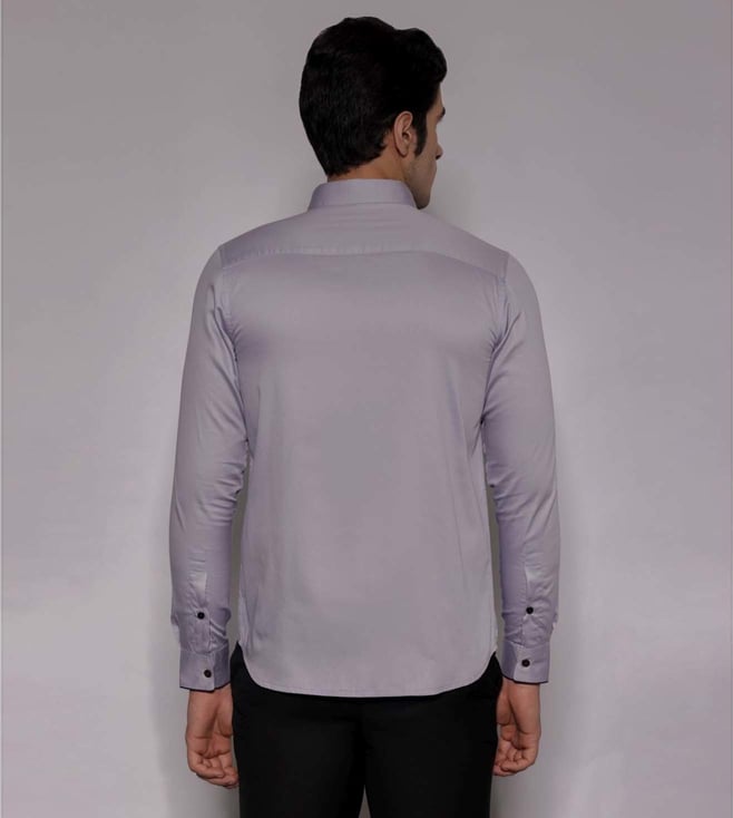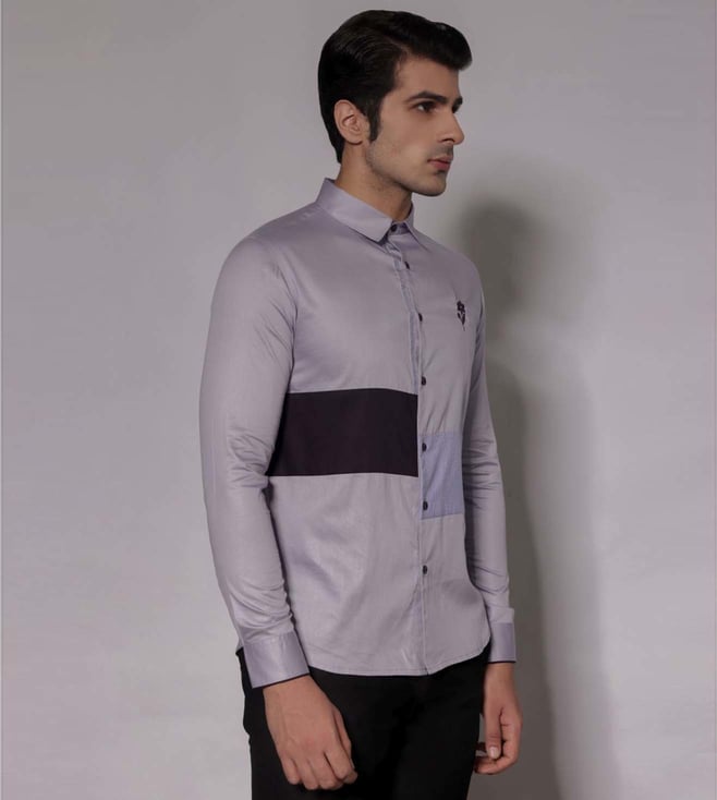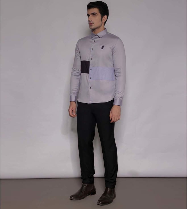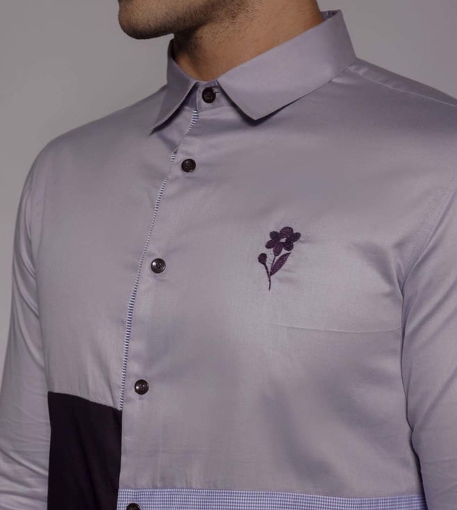 This cotton satin full-sleeve shirt has a stylised cut-and-sew front panel with floral embroidery and half tape detailing. Pin tucks and piping on the cuffs add texture. Pair it with dark tailored trousers and minimal accessories for a bold, modern party look. Disclaimer: All other items in the image are only for display purposes and will not be a part of the delivery content. Product colour may slightly vary due to photographic lighting sources. Country of Origin - India.
