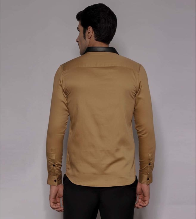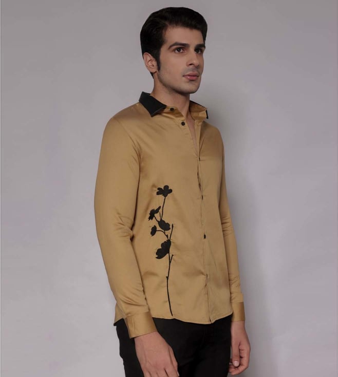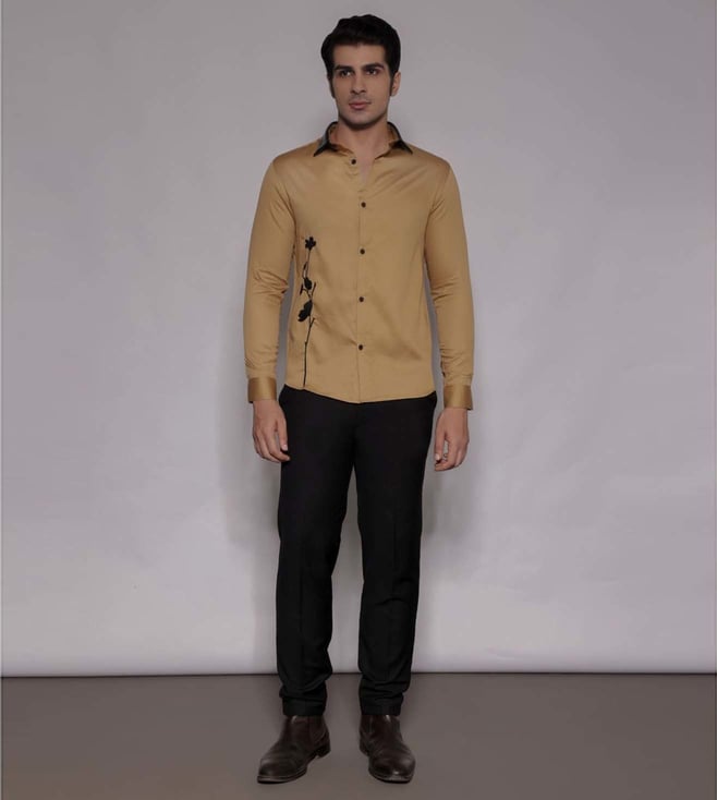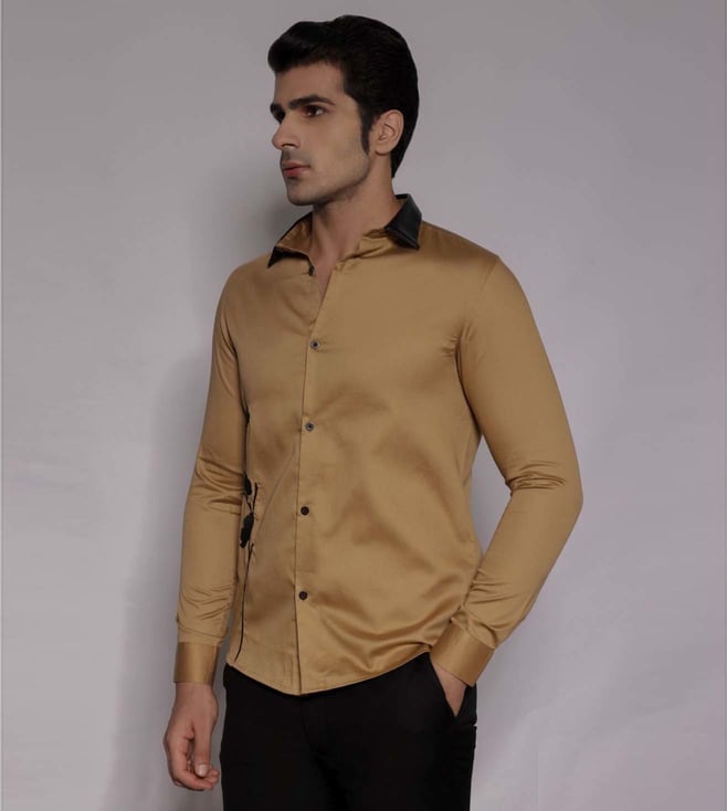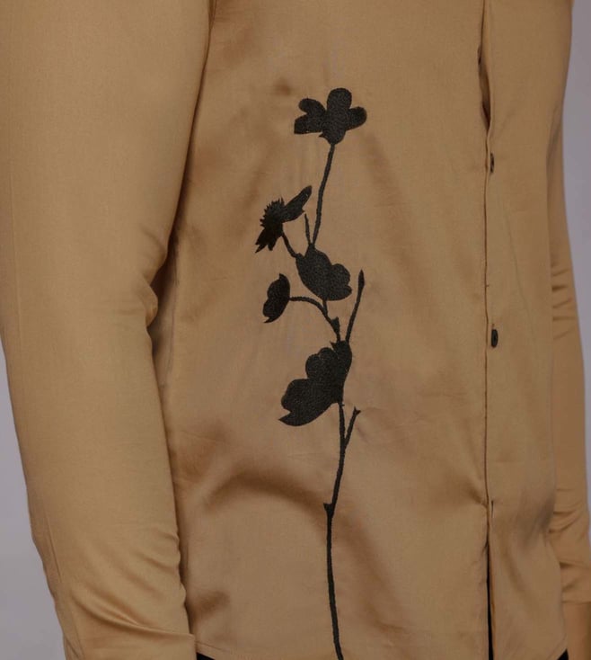 This cotton satin full-sleeve shirt features a black leather collar and a bold floral embroidery on the front panel. Finished with a normal placket and clean hemline, it combines classic tailoring with contemporary style. Pair with slim-fit trousers and polished shoes for refined evening wear. Disclaimer: All other items in the image are only for display purposes and will not be a part of the delivery content. Product colour may slightly vary due to photographic lighting sources. Country of Origin - India.