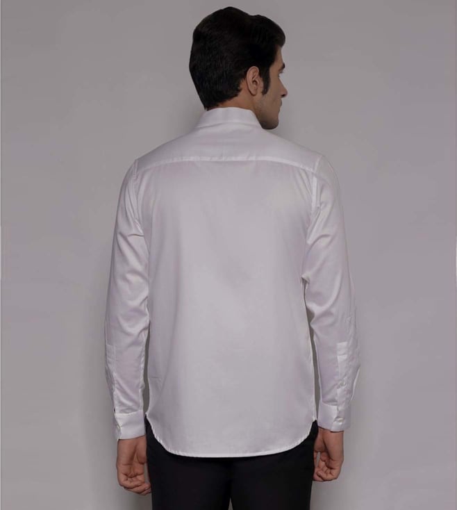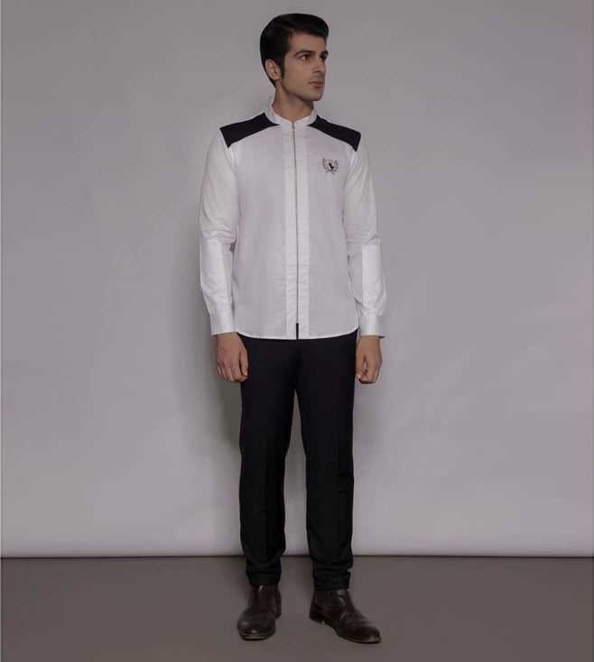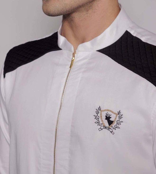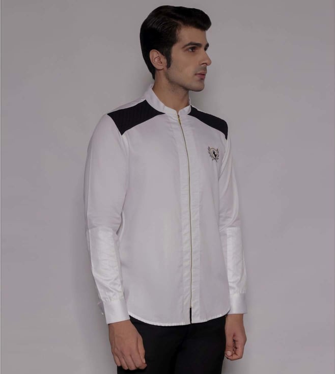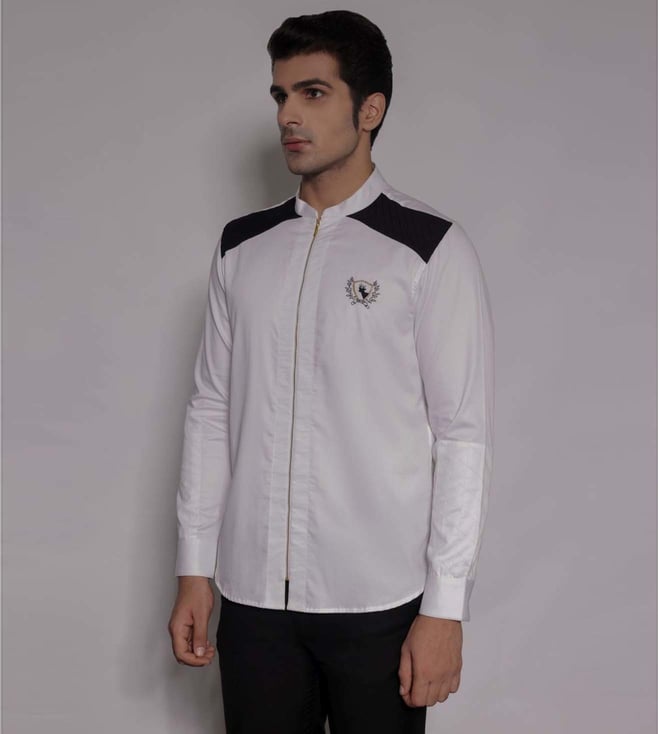 This full-sleeve shirt in cotton satin blends minimal elegance with bold details. It features a stylised collar, a quilted shoulder panel for contrast, a gold metallic zipper, and a finely embroidered crest. The curved hemline makes it ideal for modern evening sophistication. Pair it with tailored trousers or dark denim for a polished statement. Disclaimer: All other items in the image are only for display purposes and will not be a part of the delivery content. Product colour may slightly vary due to photographic lighting sources. Country of Origin - India.
