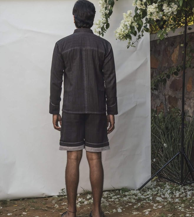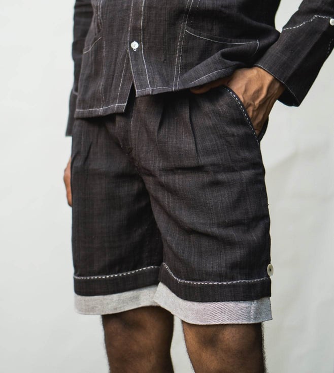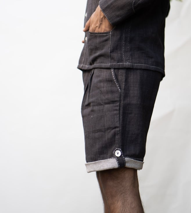 These shorts come with a foldable hem. They include side pockets, button-down fly and belt loops. They are highlighted with the stitch lines and mother-of-pearl buttons. Note that the fabric is hand spun and hand woven and naturally dyed, so colour and texture may vary. It is made of 100 percent cotton fibres and natural material. It comes from the Sonder collection. Disclaimer: All other items in the image are only for display purposes and will not be a part of the delivery content. Product colour may slightly vary due to photographic lighting sources. Country of Origin - India.