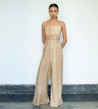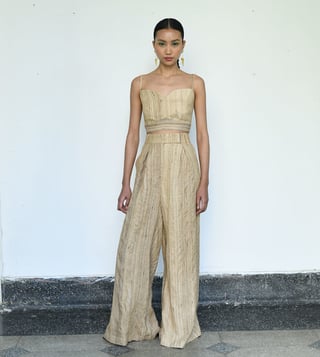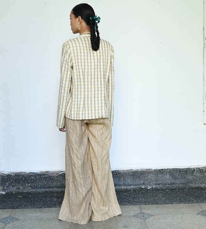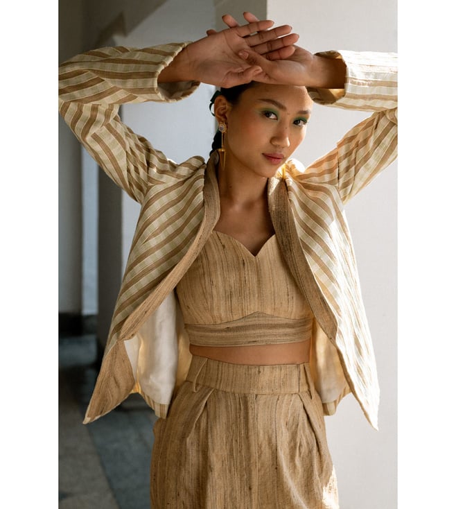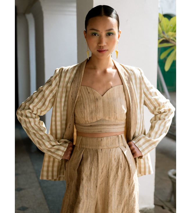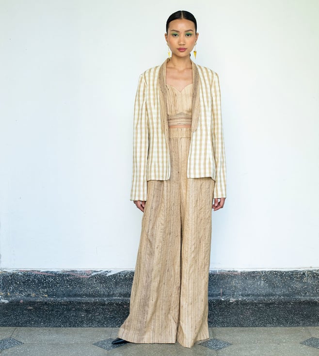 Elegant linen coat with a sophisticated shawl collar, styled with a beige linen silk bralette and flowy pleated¿pants.