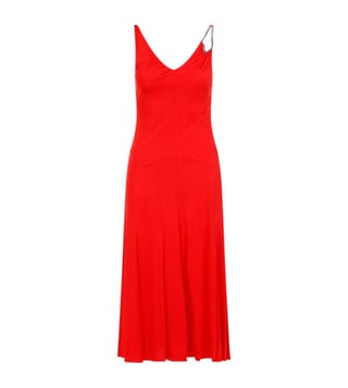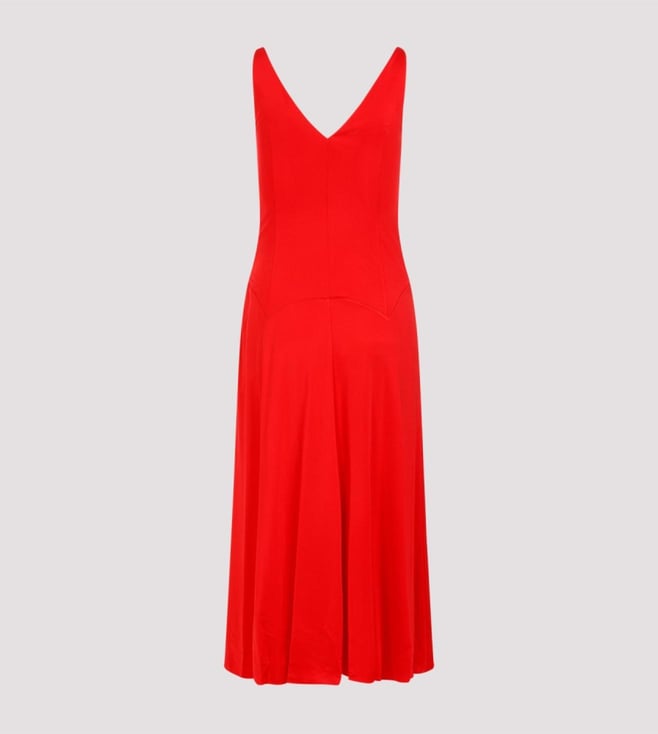 Unleash your inner diva with this stunning red dress, crafted from luxurious 100% viscose for a silky, breathable feel. The solid hue radiates confidence, while the sleeveless design and V-neckline add a touch of allure. Perfectly tailored to flatter, this dress drapes elegantly, accentuating your silhouette. The seamless closure ensures a sleek finish, making it an ideal choice for any occasion where you want to make a bold, unforgettable statement. Embrace the power of red and turn heads effortlessly.