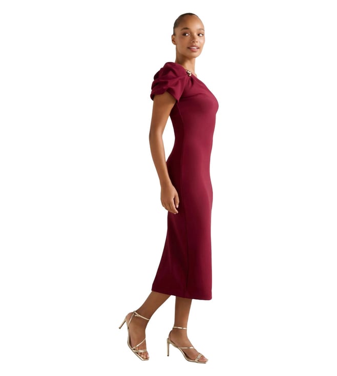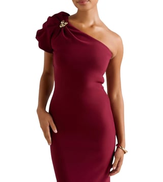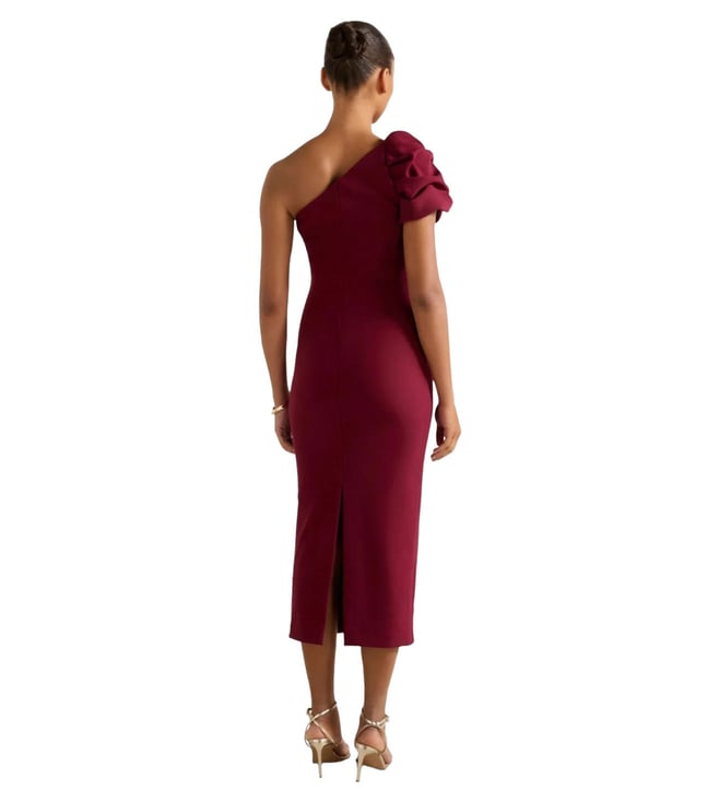 Elevate your wardrobe with the effortlessly chic Linda One-Shoulder Midi Dress from Forever New. Perfect for any special occasion, this dress features a fitted silhouette, elegant one-shoulder neckline, and a gathered puff sleeve with gold-tone hardware for a touch of glamour. Crafted from a smooth stretch fabric, this dress also boasts a back slit and zip closure for added sophistication. Made with at least 50 percent recycled polyester, this sustainable piece is as stylish as it is eco-friendly.