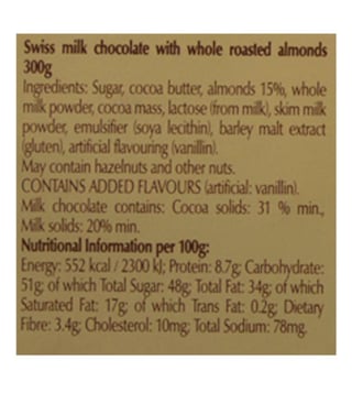 Sugar, Cocoa Butter, Almonds (15%), Whole Milk Powder, Cocoa Mass, Lactose (Cow Milk), Skimmed Milk Powder, Emulsifier (Soya Lecithin), Barley Malt Extract (Gluten), Artificial Flavouring (Vanillin). Milk Chocolate Contains Cocoa Solids (31%), Min, Milk Solids (20%). Contain Milk, Almonds, Barley, Soya.