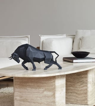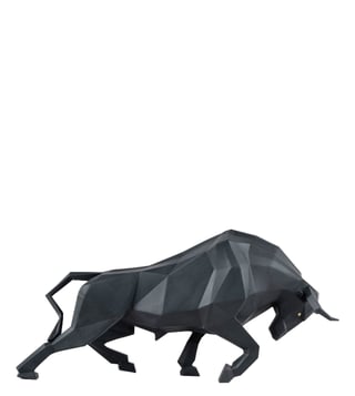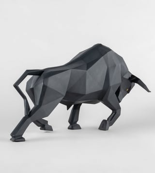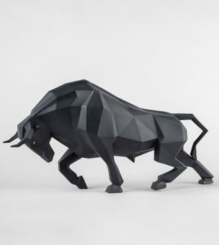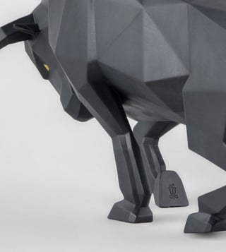 A creation portraying a bull in it is typical pose as it prepares to charge. Part of the origami collection which offers a geometric and conceptual vision of the animal kingdom. This sculpture is handcrafted in matte black porcelain with a touch of color in the animals eyes.