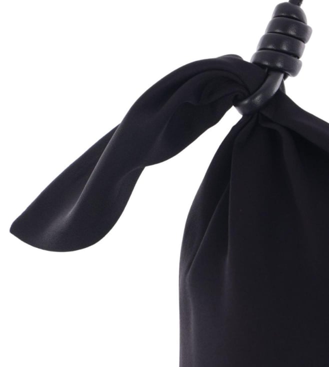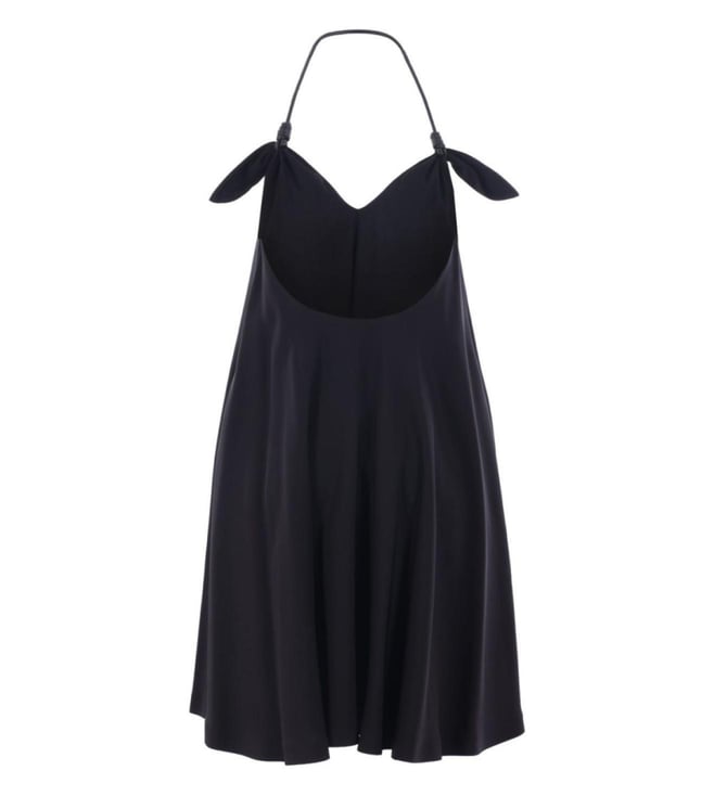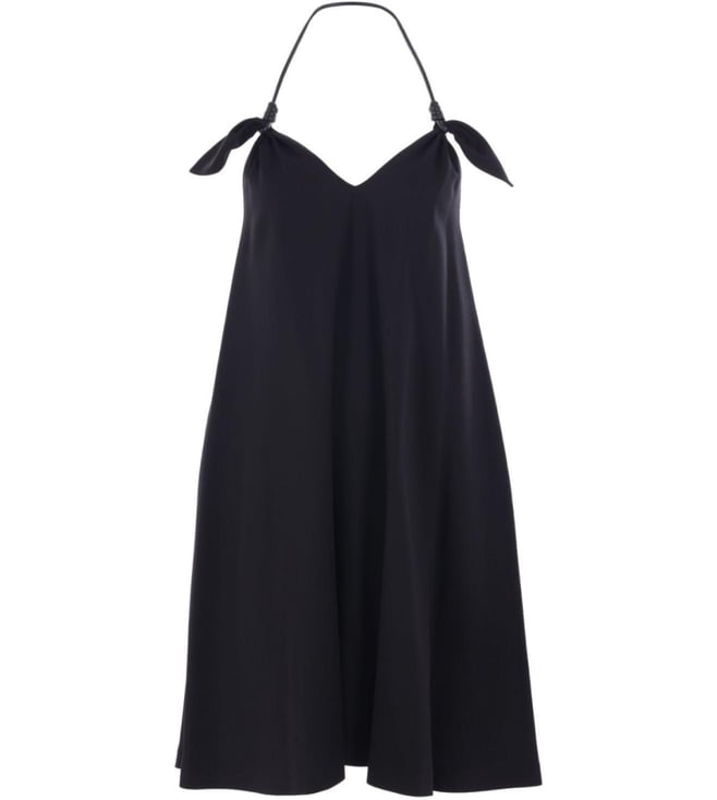 Unveil elegance with this stunning black dress, a masterpiece of modern sophistication. Crafted from a luxurious blend of viscose and elastane, it drapes effortlessly, offering a flattering silhouette. The solid black hue exudes timeless allure, while the sleeveless design and halter neck add a touch of contemporary chic. Perfectly tailored for the modern woman, its sleek closure ensures a seamless fit, making it an ideal choice for any occasion where style and grace are paramount.