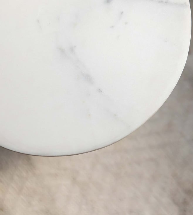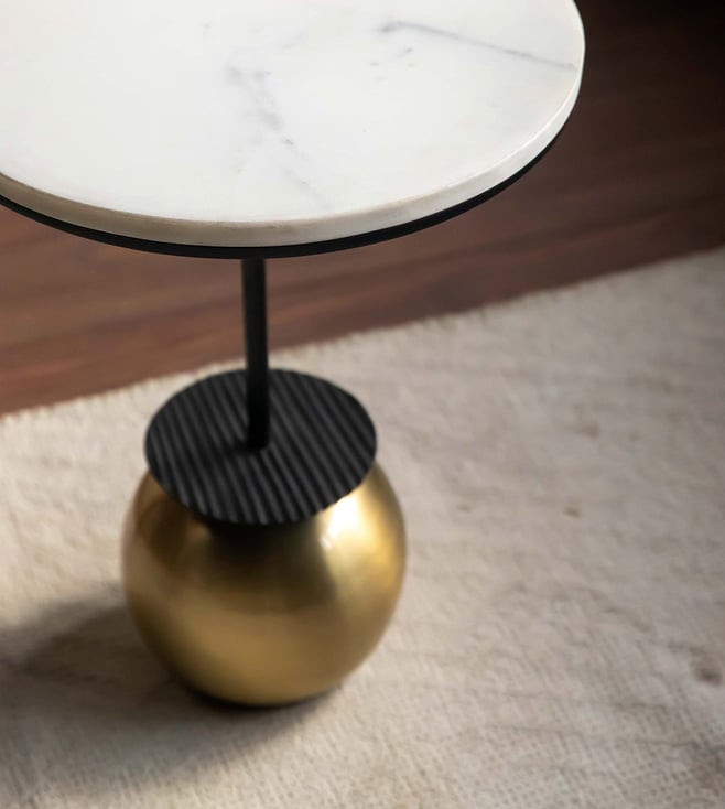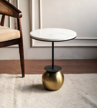 Add a refined touch to your d¿cor with this modern and elegant Jake Side table, featuring a sophisticated mix of materials and geometric balance. The round white marble tabletop offers a clean, minimalist surface, supported by a contrasting brushed gold orb for a striking visual statement. Perfect for contemporary or eclectic spaces, this table functions beautifully as a chic spot for a lamp, drink. Material: Marble and Mild Steel Weight: 11.484 kg Care Instructions: Wipe with a soft, dry cloth avoid the use of abrasive cleaning products.