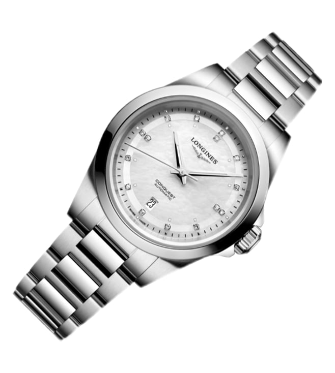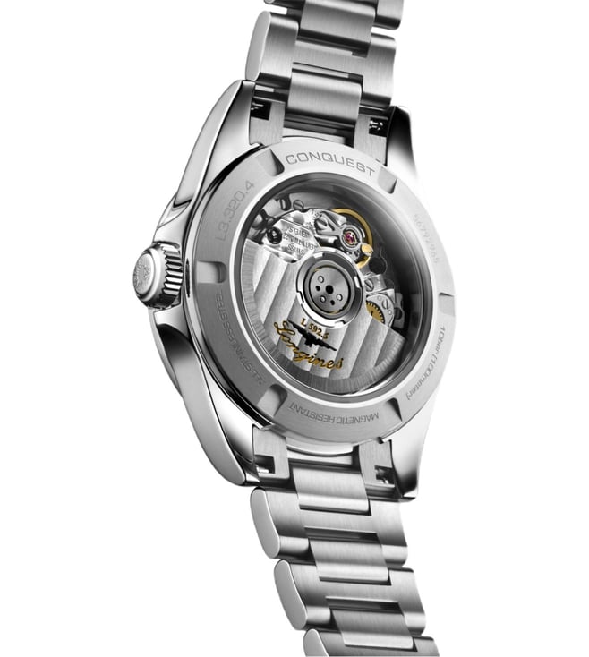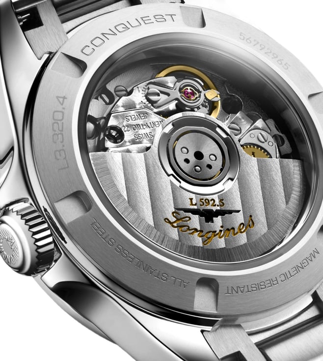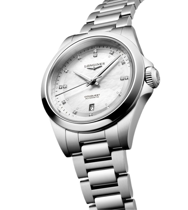 Discover the Longines CONQUEST L3.320.4.87.6 Watch, manufactured in keeping with tradition for an elegance beyond compare. Self winding mechanical movement beating at 28'800 vibrations per hour, with a monocrystalline silicon balance spring power reserve up to 45 hours. Dial set with 15 Top Wesselton VS SI diamonds, for a total of 0.037 carats. Screw down and transparent with sapphire crystal case back.