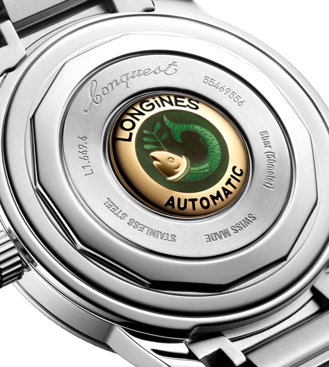 Self-winding mechanical movement beating at 25'200 vibrations per hour, with a monocrystalline silicon balance-spring power reserve up to 72 hours.18 karat gold medallion with fish, water-resistant to 5 bar, scratch-resistant sapphire crystal, with several layers of anti-reflective coating on both sides. Black lacquered polished dial, swiss super-luminova . Stainless steel bracelet, with double security folding clasp with micro adjustment system.