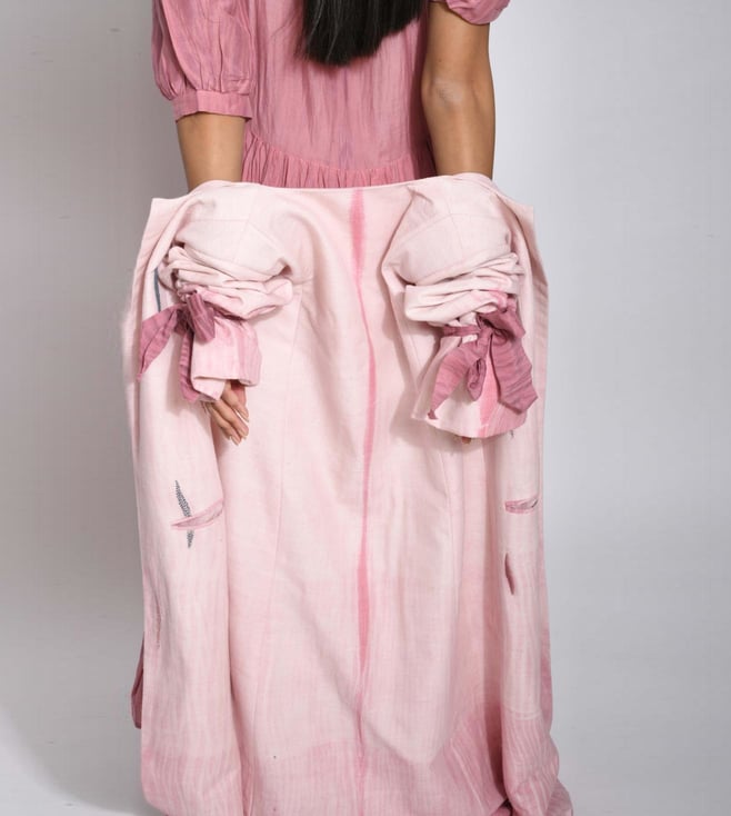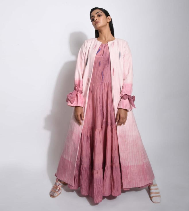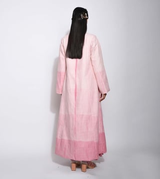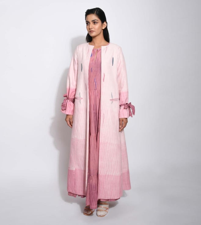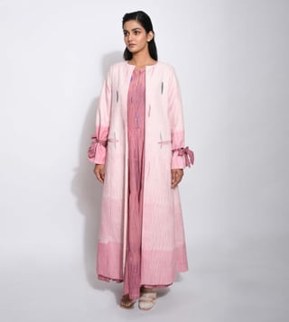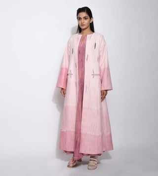 This jacket from The Loom Art is made of handwoven matka silk fabric which was woven by the weavers in Murshidabad. In this Between The lines collection, experts have employed the dying technique of arashi shibori to create texture on the garment. It's a boxy front open overcoat jacket with two pockets in the front and detailed kantha and French knot hand embroidery on the front. Disclaimer: All other items in the image are only for display purposes and will not be a part of the delivery content. Product colour may slightly vary due to photographic lighting sources. Country Of Origin - India.
