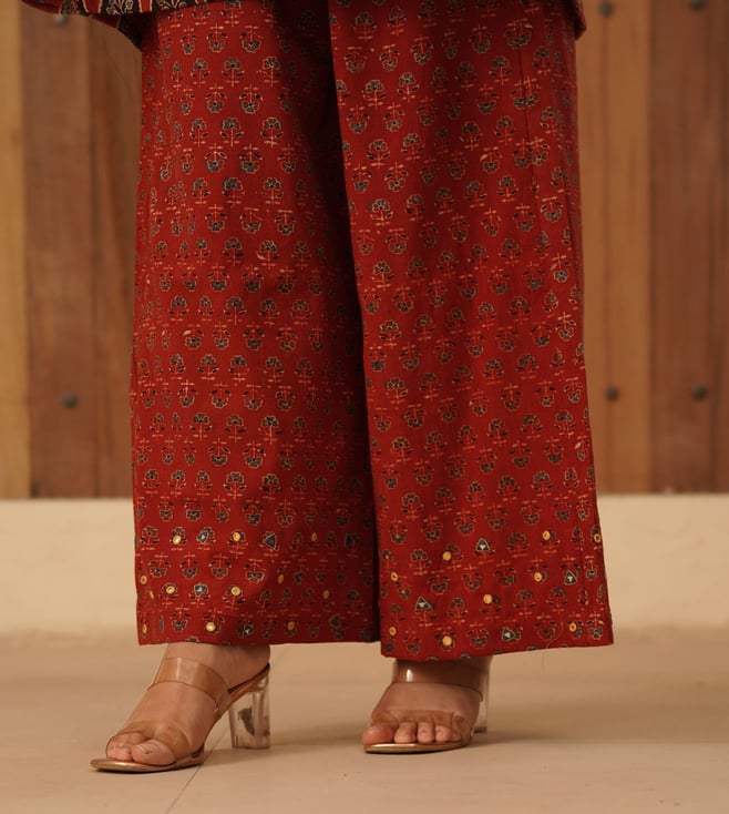 Look chic and trendy with this maroon Love Chic Ajrakh Cotton Palazzo. Made of soft cotton fabric, it features intricate hand embroidery, perfect for festive occasions. Designed for women who love to make a style statement!' Disclaimer: All other items in the image are only for display purposes and will not be a part of the delivery content. Product colour may slightly vary due to photographic lighting sources. Country of Origin - India.