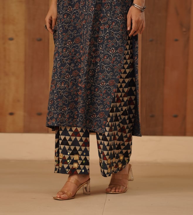 Enhance your festive look in style with our Love Chic Ajrakh Cotton Palazzo. Indigo-colored cotton fabric is hand-embroidered for a touch of elegance. Perfect for women who want to make a statement and feel comfortable. By LOVE CHIC.' Disclaimer: All other items in the image are only for display purposes and will not be a part of the delivery content. Product colour may slightly vary due to photographic lighting sources. Country of Origin - India.