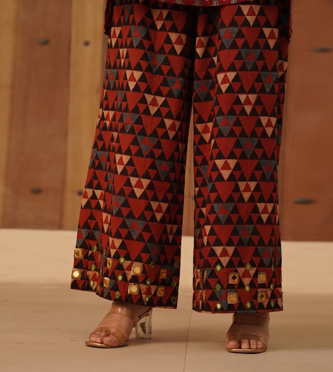 Elevate your festive wardrobe with Love Chic's Maroon Ajrakh Cotton Palazzo. Hand-embroidered with intricate designs, this palazzo is perfect for any occasion. Made with 100% pure cotton, it offers comfort and style for women of all ages.' Disclaimer: All other items in the image are only for display purposes and will not be a part of the delivery content. Product colour may slightly vary due to photographic lighting sources. Country of Origin - India.