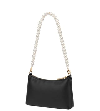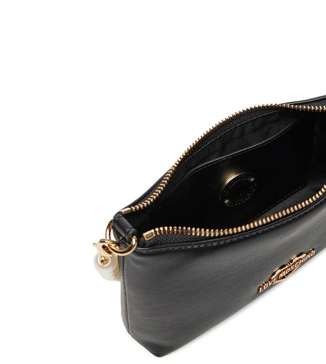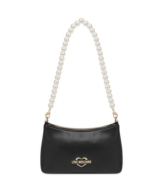 Love moschino black heart logo mini shoulder bag crafted in polyurethane featuring zip closure, 1 compartment, metal logo, removable faux-pearls shoulder strap.