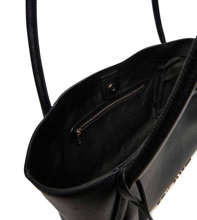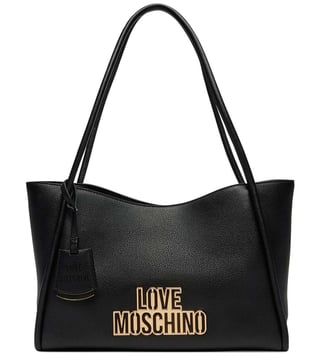 Love moschino black logo-applique large tote crafted in polyurethane featuring magnetic closure, 1 compartment, inside zip pocket, metal logo, dual carry handles.