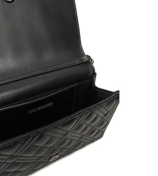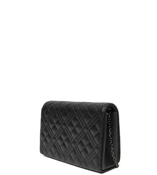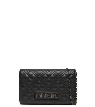 Love moschino black quilted small crossbody bag crafted in polyurethane featuring magnetic closure, 1 compartment, inside card slots, front logo with chain crossbody strap.