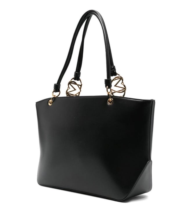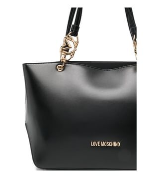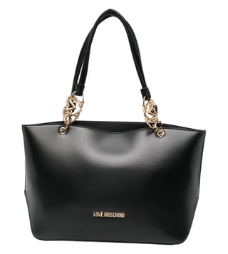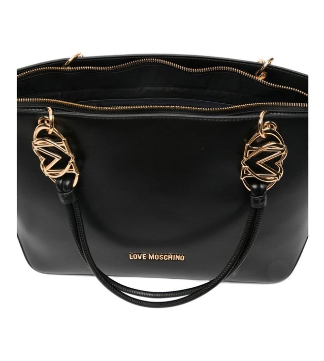Black heart embellished chain link zip closure main compartment metal logo dual carry handles. With its timeless design and practical features, this bag is a must-have accessory for the modern woman on-the-go.