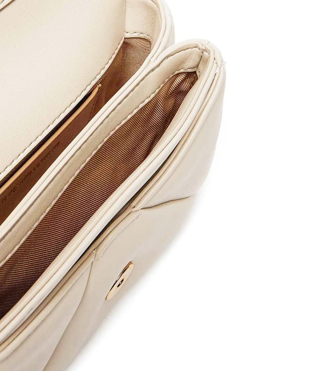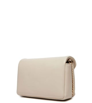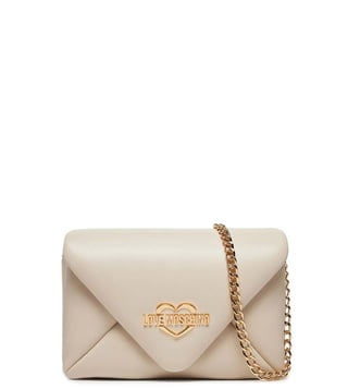 Love moschino ecru heart logo mini crossbody bag crafted in leather and polyurethane featuring magnetic closure, 2 compartments, inside slip pocket, metal logo, chain crossbody strap.