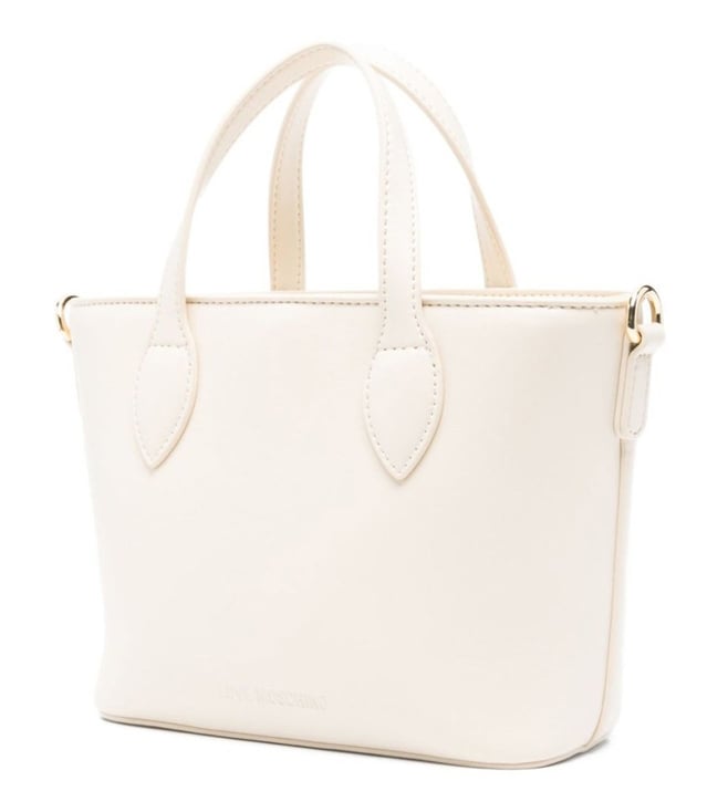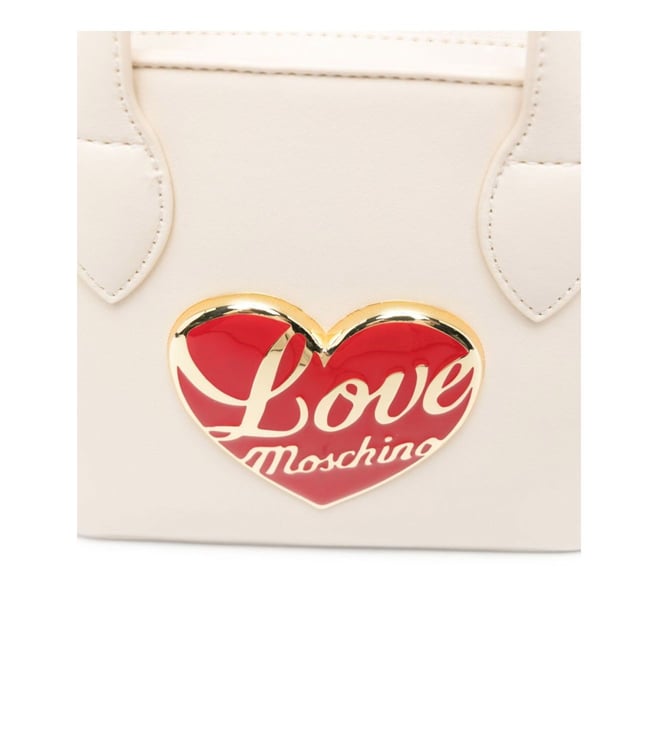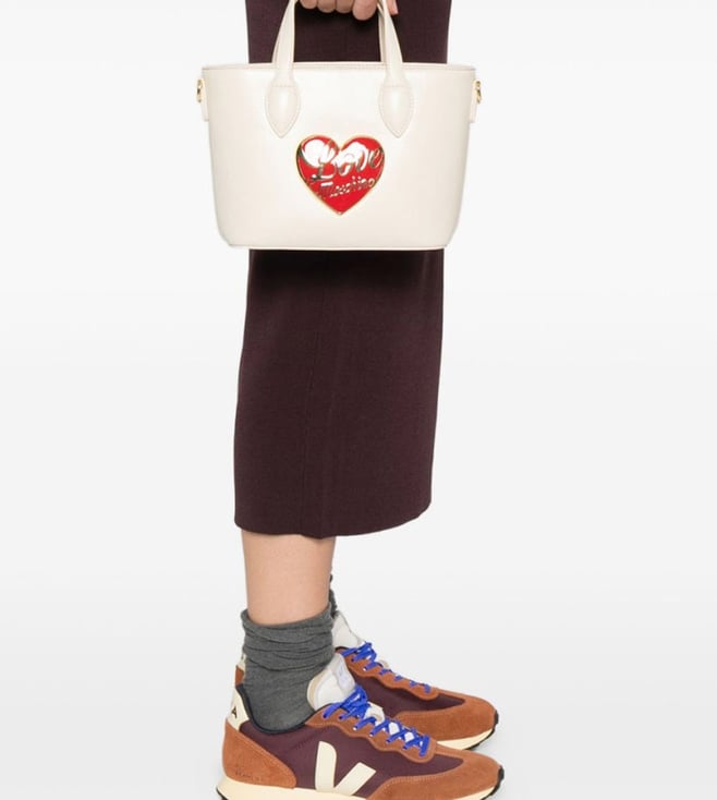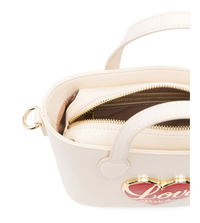 Off-white heart-shaped plaque gold-tone lettering two top flap handles zip fastening detachable shoulder strap