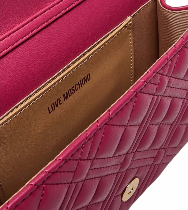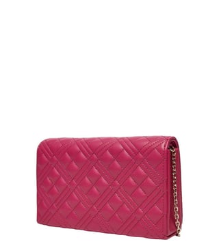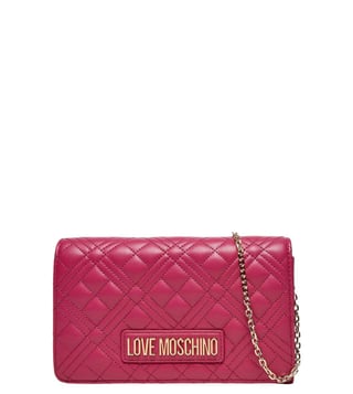 Love moschino fuchsia quilted small crossbody bag crafted in polyurethane featuring magnetic closure, 1 compartment, inside card slots, front logo with chain crossbody strap.