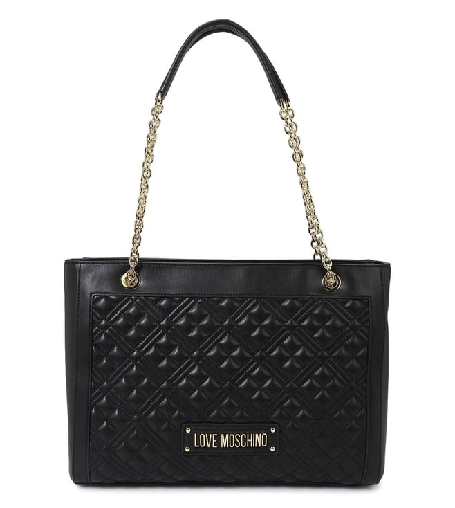 Women Black Quilted Lm Lettering Chain-Handle Tote Bag