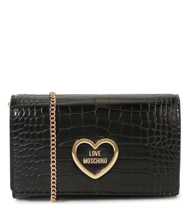 Women Black Croc-Skin Pattern Lm Heart Cross Body Bag