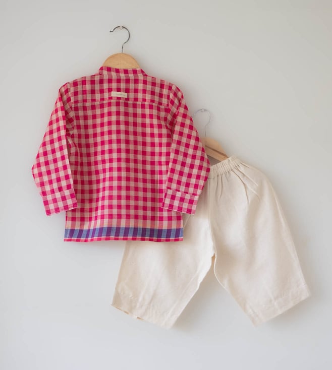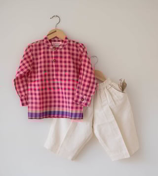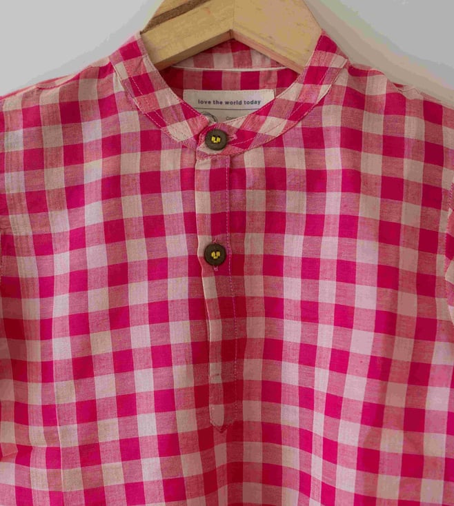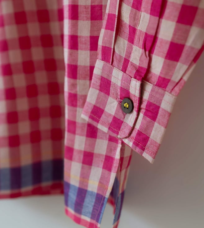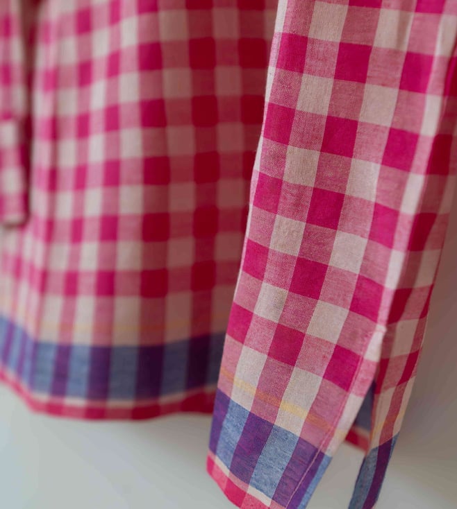 Light as a candy cloud this unlined shirt kurta is crafted in a handwoven blend of cotton and silk¿woven by skilled hands into a delicate pink checkered fabric that catches the light with a subtle, natural sheen. The fabric is cool, breathable, and incredibly lightweight.Cut in a relaxed, straight-fit silhouette, it blends the ease of a kurta with the structure of a classic shirt. Minimal detailing keeps the focus on the fabric¿s inherent beauty, while thoughtful tailoring makes it versatile enough to dress up or down.