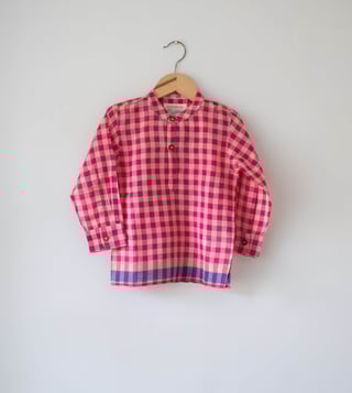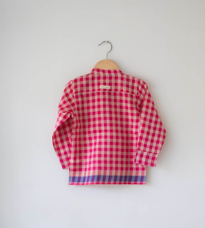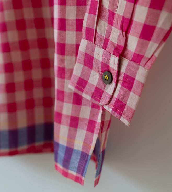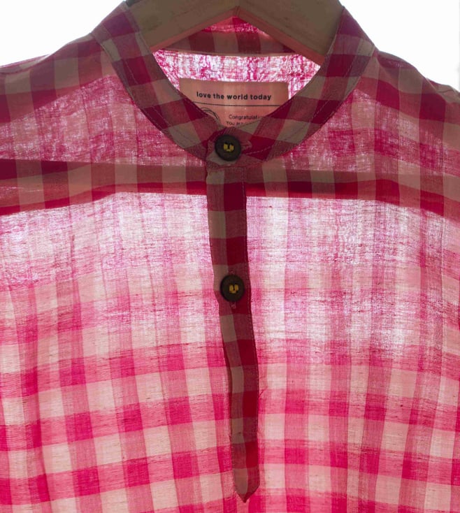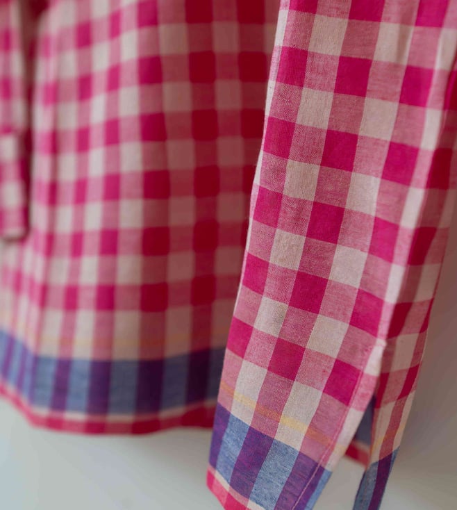 Light as a candy cloud this unlined shirt kurta is crafted in a handwoven blend of cotton and silk¿woven by skilled hands into a delicate pink checkered fabric that catches the light with a subtle, natural sheen. The fabric is cool, breathable, and incredibly lightweight. Cut in a relaxed, straight-fit silhouette, it blends the ease of a kurta with the structure of a classic shirt. Minimal detailing keeps the focus on the fabric¿s inherent beauty, while thoughtful tailoring makes it versatile enough to dress up or down.Made with 100% soft and breathable handwoven cotton silk.