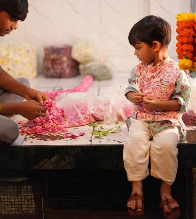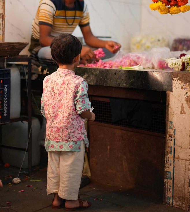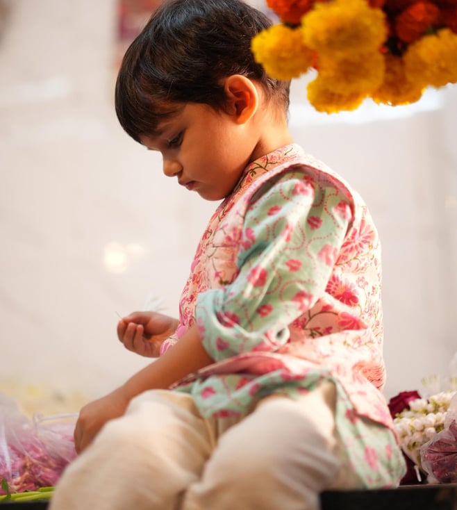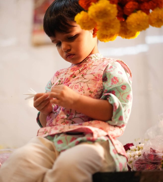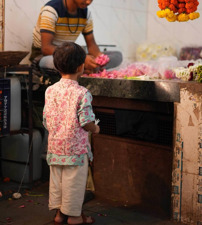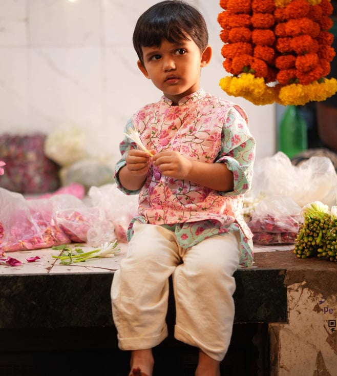 Have you even done festivals right, if not for one of those comfortable kurtas & Bandi Pants set. Vibrant, classic, detailed and comfortable! This set goes from festivities to playtime to sleepy time. Here's an easy breezy kurta, bandi & pants set in a custom Love the World Today hand block print that can not only take your little one's sweaty dance time but also convert into a soft cloud cover for sleep time (Remove the Bandi)! Your little one will steal hearts wherever they go.Kurta & Bandi Made with soft and breathable cotton, Bandi Lined with 100% cotton.