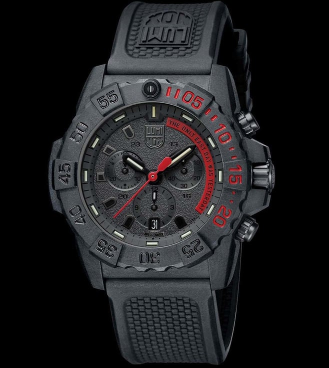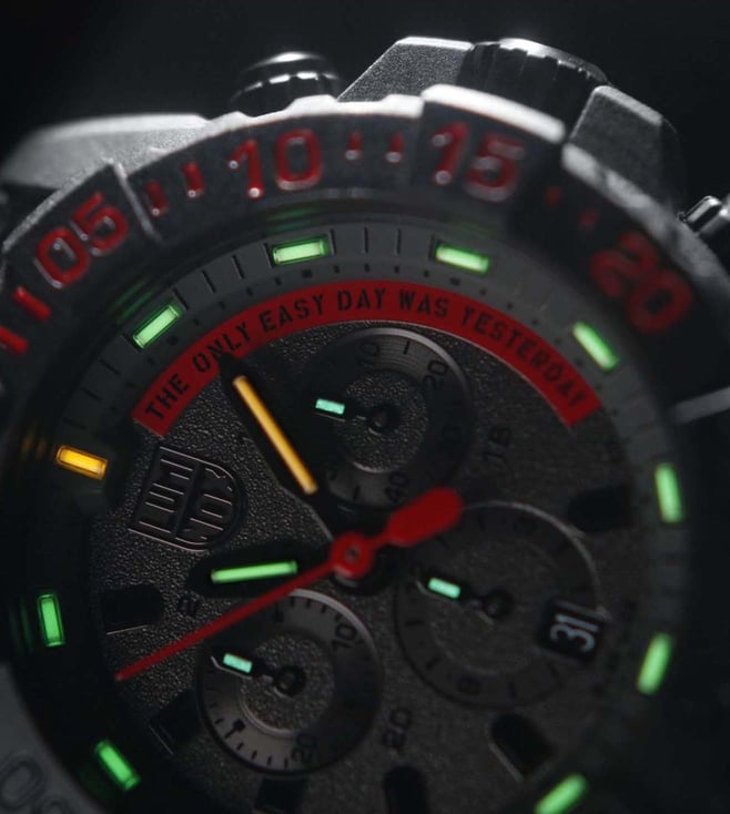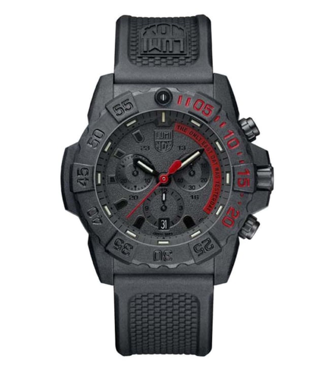 Merging contemporary style with performance, this men's analog watch from Luminox will lend you a modish look. The black round dial is secured by a hardlex glass. It exudes plain three hands, stick hour markings, a date display window, three subdials, two pushers and a crown for time adjustment. The silicon strap flaunts a stunning black hue that accentuates the look of the watch. Furthermore, it is completed with a buckle clasp to ensure a secure fit on the wrist.
