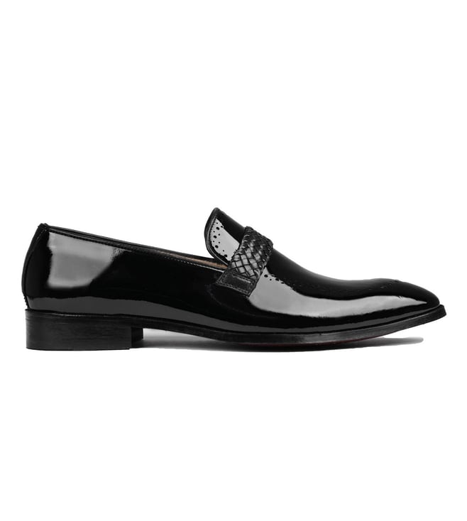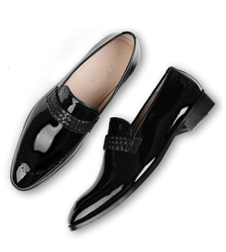 These loafers with a refined slip-on design are revisited with an understated silhouette. Smooth patent upper, brogue detailing¿complemented with hand-weaved Nappa saddle adds to the elegance of these modern design loafers.