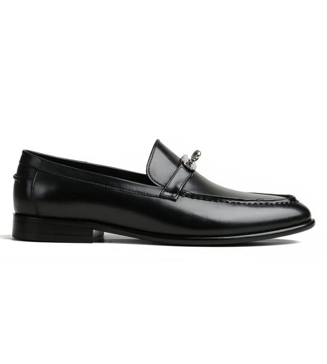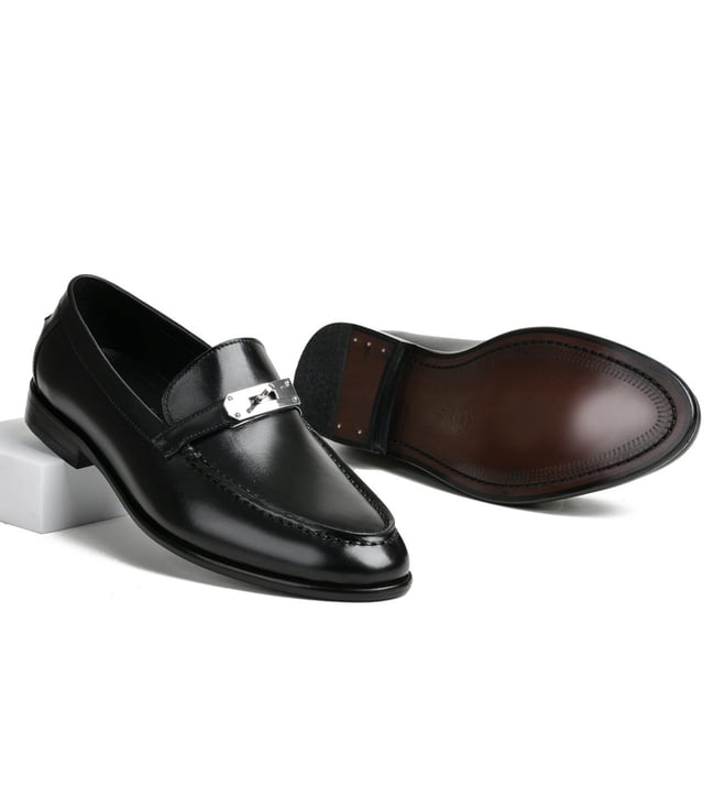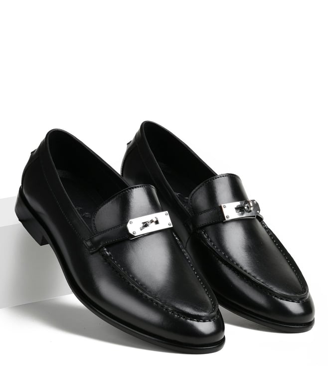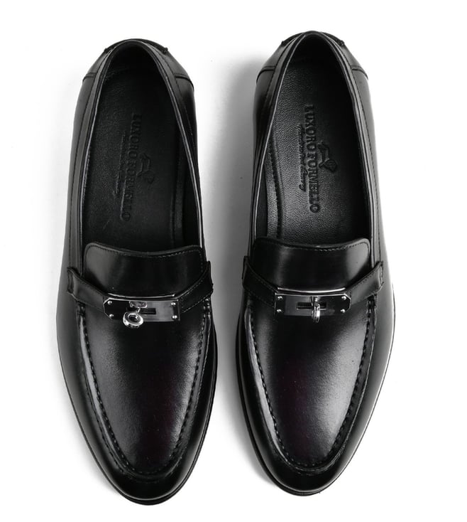 Discover true luxury with the Stellar black burnished leather loafers. Made with a handmade stitched sole and handweaved vamp, these slipons offer both flexibility and style. The smooth burnishing and twist lock decorative buckle adds a regal touch to these exquisite shoes.