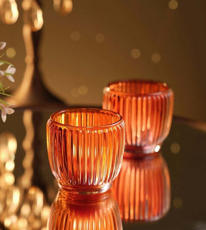 Orange Glass Ribbed Small Tealight Holders - Set of 4