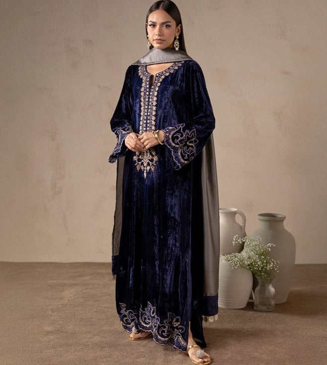 Khusboo & Pankaj Navy Blue Velvet Kurta With Pants & Dupatta