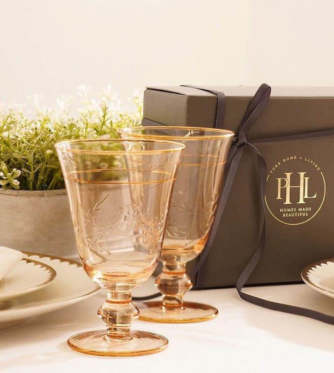 Clear & Yellow Glass Floral Print Wine Glasses (0.3 L) - Set of 2
