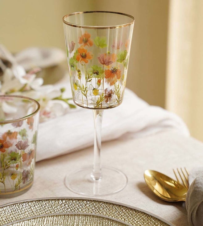 Orange & Green Glass Floral Print Wine Glasses (0.3 L) - Set of 2