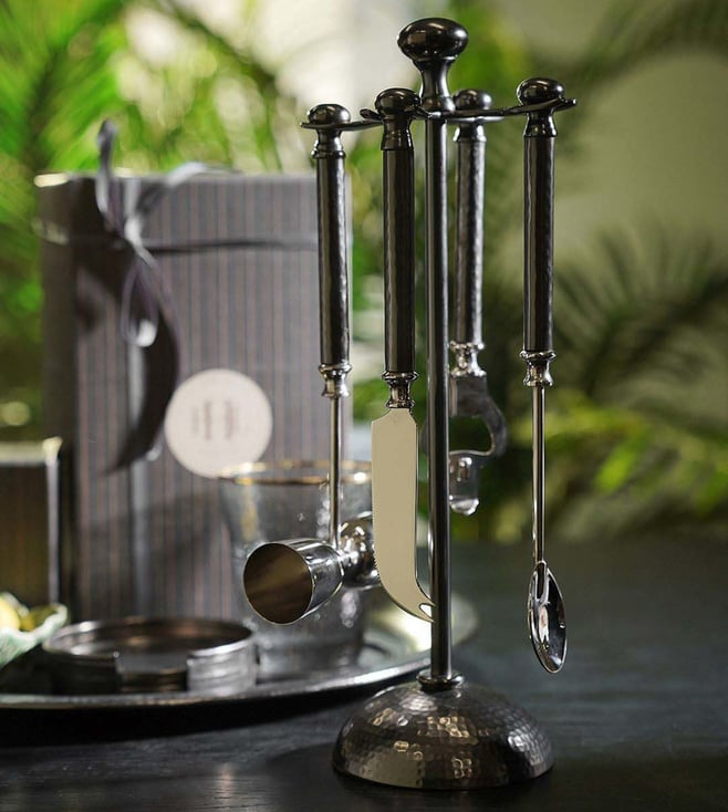 Grey Stainless Steel Matt Finish Hammered Bar Tool Set With Base - Set of 5