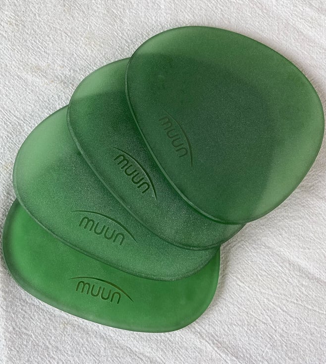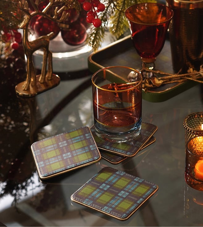 Set Of 4 Green Blue Plaid Faux Leather Coasters