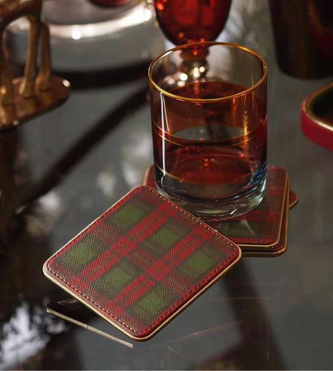 Set Of 4 Red Green Plaid Faux Leather Coasters