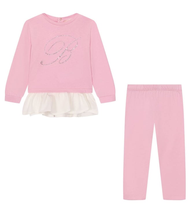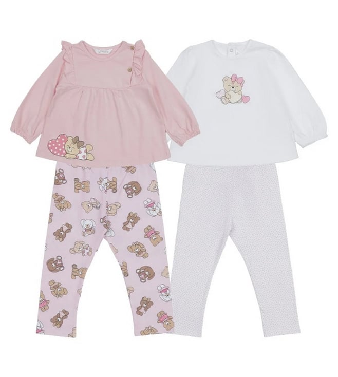 Kids Pink & White Teddy Printed 2Pc Leggings Set